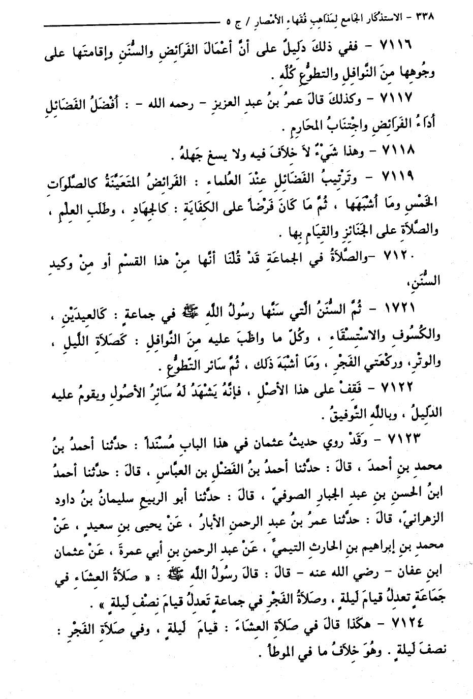 7120 - وَالصَّلَاةُ فِي الْجَمَاعَةِ قَدْ قُلْنَا: إِنَّهَا مِنْ هَذَا الْقِسْمِ أَوْ مِنْ وَكِيدِ السُّنَنِ.