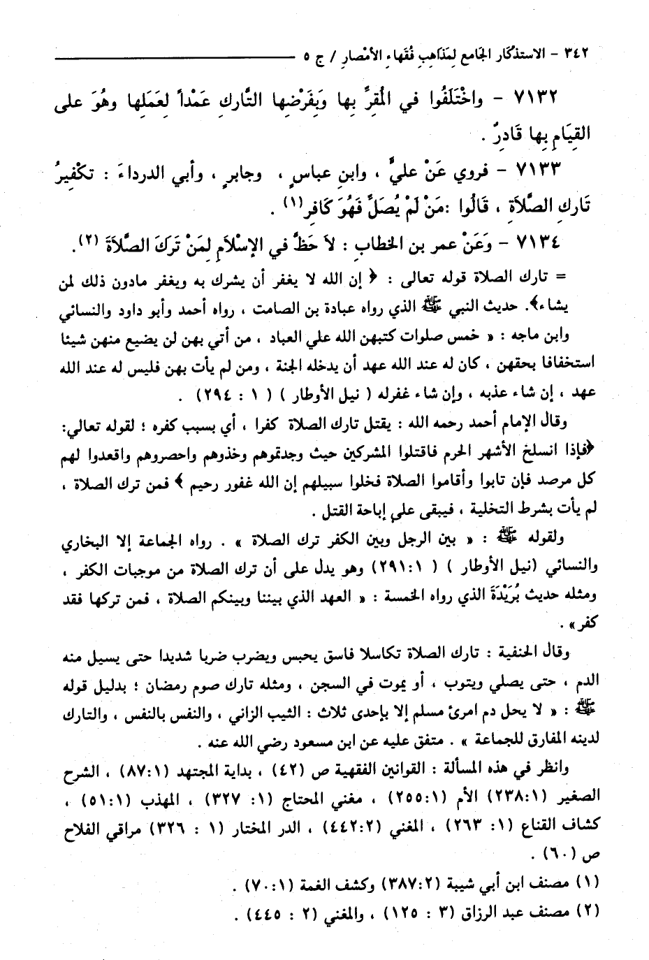 7133 - فَرُوِيَ عَنْ عَلِيٍّ، وَابْنِ عَبَّاسٍ، وَجَابِرٍ، وَأَبِي الدَّرْدَاءِ تَكْفِيرُ تَارِكِ الصَّلَاةِ، قَالُوا: مَنْ لَمْ يُصَلِّ فَهُوَ كَافِرٌ.