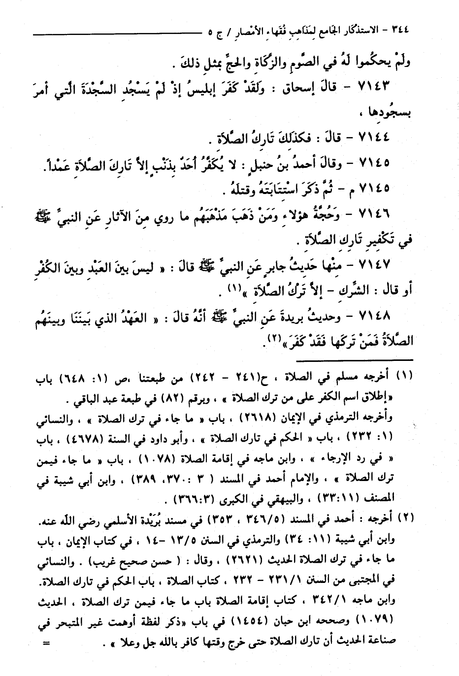 7146 - وَحُجَّةُ هَؤُلَاءِ وَمَنْ ذَهَبَ مَذْهَبَهُمْ مَا رُوِيَ مِنَ الْآثَارِ عَنِ النَّبِيِّ - صَلَّى اللَّهُ عَلَيْهِ وَسَلَّمَ - فِي تَكْفِيرِ تَارِكِ الصَّلَاةِ.