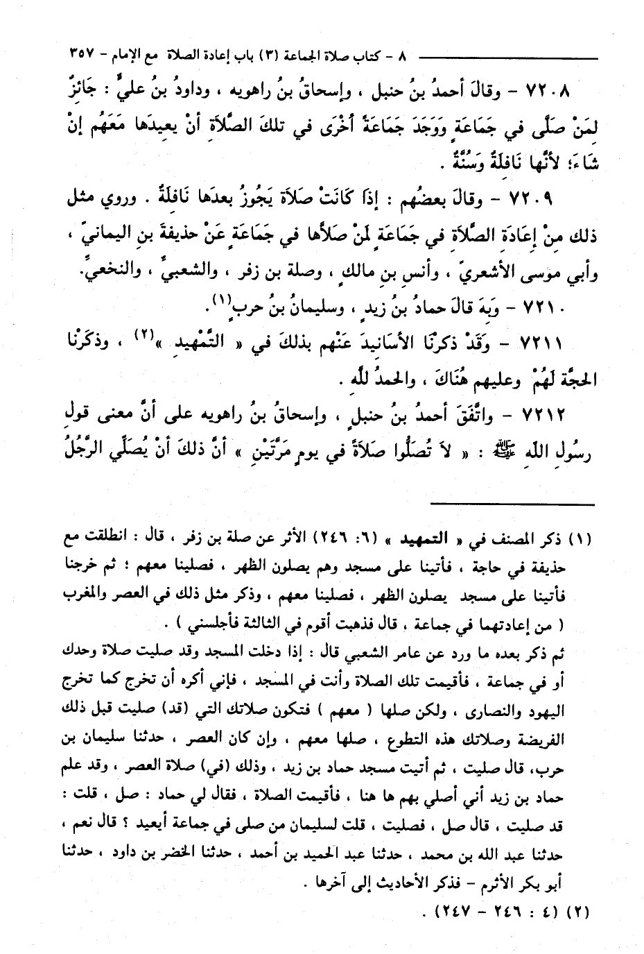 7212 - وَاتَّفَقَ أَحْمَدُ بْنُ حَنْبَلٍ وَإِسْحَاقُ بْنُ رَاهَوَيْهِ عَلَى أَنَّ مَعْنَى قَوْلِ رَسُولِ اللَّهِ - صَلَّى اللَّهُ عَلَيْهِ وَسَلَّمَ -: "لَا تُصَلُّوا صَلَاةً فِي يَوْمٍ مَرَّتَيْنِ " أَنَّ ذَلِكَ أَنْ يُصَلِّيَ الرَّجُلُ
