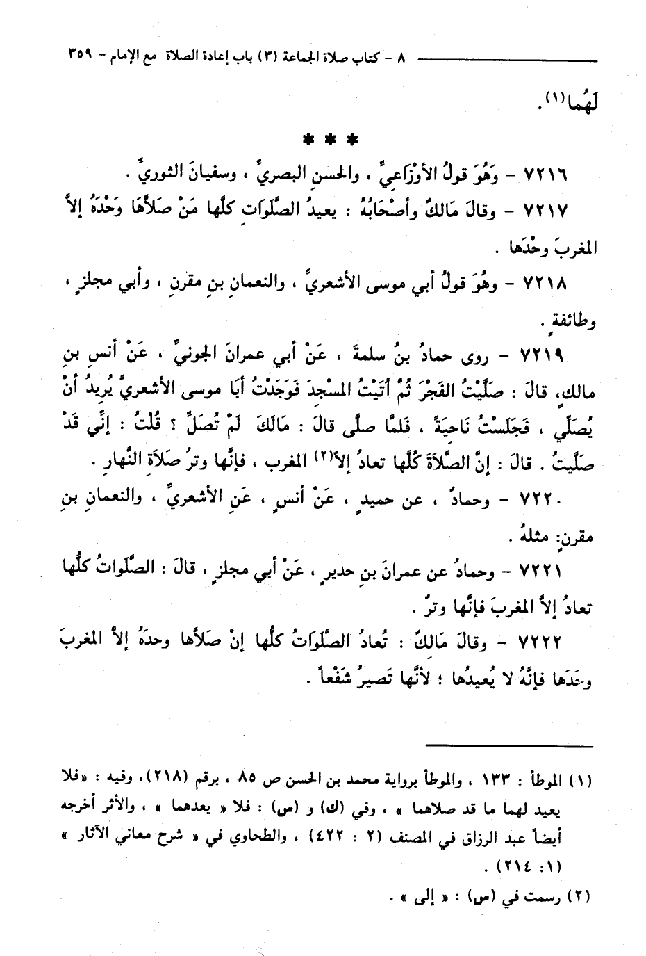 7219 - رَوَى حَمَّادُ بْنُ سَلَمَةَ، عَنْ أَبِي عِمْرَانَ الْجَوْنِيِّ، عَنْ أَنَسِ بْنِ مَالِكٍ، قَالَ: صَلَّيْتُ الْفَجْرَ ثُمَّ أَتَيْتُ الْمَسْجِدَ، فَوَجَدْتُ أَبَا مُوسَى الْأَشْعَرِيَّ يُرِيدُ أَنْ يُصَلِّيَ فَجَلَسْتُ نَاحِيَةً، فَلَمَّا صَلَّى قَالَ: مَا لَكَ لَمْ تُصَلِّ ؟ قُلْتُ: إِنِّي قَدْ صَلَّيْتُ. قَالَ: إِنِ الصَّلَاةَ كُلَّهَا تُعَادُ إِلَّا الْمَغْرِبَ، فَإِنَّهَا وِتْرُ صَلَاةِ النَّهَارِ.