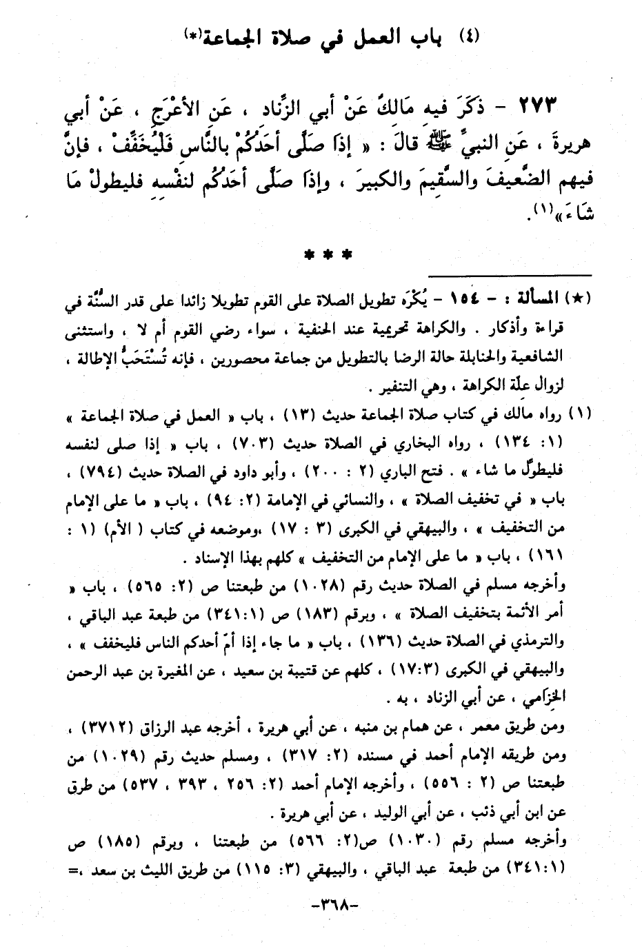273 - ذَكَرَ فِيهِ مَالِكٌ عَنْ أَبِي الزِّنَادِ، عَنِ الْأَعْرَجِ، عَنْ أَبِي هُرَيْرَةَ، عَنِ النَّبِيِّ - صَلَّى اللَّهُ عَلَيْهِ وَسَلَّمَ - قَالَ: " إِذَا صَلَّى أَحَدُكُمْ بِالنَّاسِ فَلْيُخَفِّفْ ; فَإِنَّ فِيهِمُ الضَّعِيفَ وَالسَّقِيمَ وَالْكَبِيرَ، وَإِذَا صَلَّى أَحَدُكُمْ لِنَفْسِهِ فَلْيُطَوِّلْ مَا شَاءَ ".