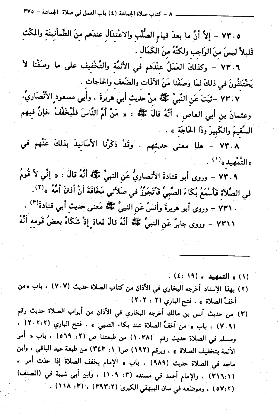7306 - وَكَذَلِكَ الْعَمَلُ عِنْدَهُمْ فِي الْأَئِمَّةِ وَالتَّخْفِيفِ عَلَى مَا وَصَفْنَا لَا يَخْتَلِفُونَ فِي ذَلِكَ لِمَا وَصَفْنَا مِنَ الْآفَاتِ وَالضَّعْفِ وَالْحَاجَاتِ.