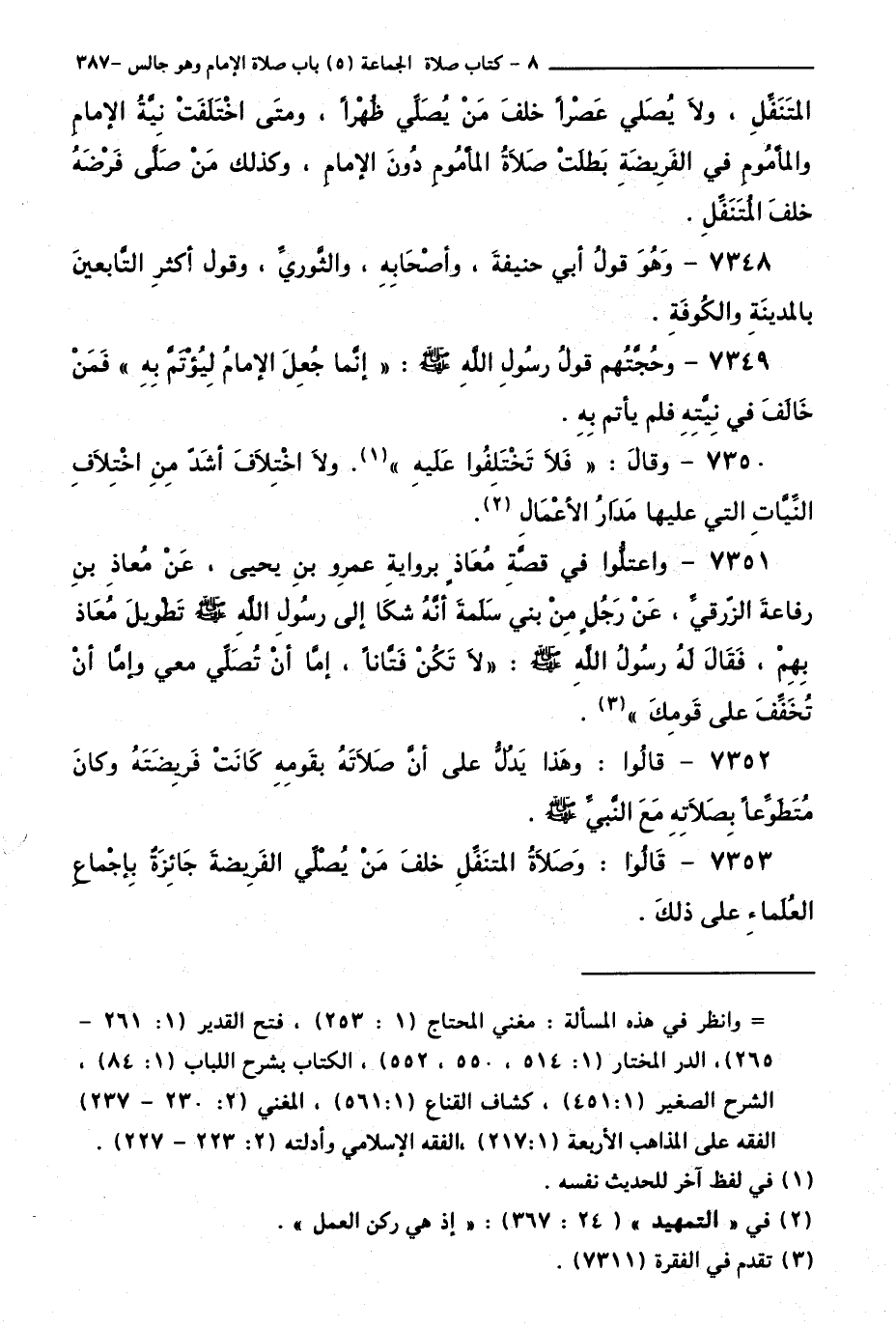 7353 - قَالُوا: وَصَلَاةُ الْمُتَنَفِّلِ خَلْفَ مَنْ يُصَلِّي الْفَرِيضَةَ جَائِزَةٌ بِإِجْمَاعِ الْعُلَمَاءِ عَلَى ذَلِكَ.