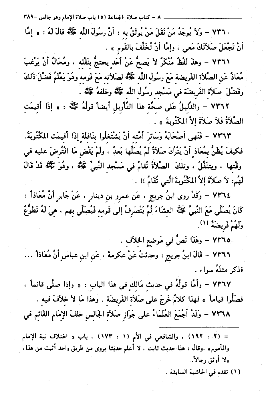 7363 - فَنَهَى أَصْحَابَهُ وَسَائِرَ أُمَّتِهِ أَنْ يَشْتَغِلُوا بِنَافِلَةٍ إِذَا أُقِيمَتِ الْمَكْتُوبَةُ، فَكَيْفَ يُظَنُّ بِمُعَاذٍ أَنْ يَتْرُكَ صَلَاةً لَمْ يُصَلِّهَا بَعْدُ وَلَمْ يَقْضِ مَا افْتُرِضَ عَلَيْهِ فِي وَقْتِهَا وَيَتَنَفَّلُ وَتِلْكَ تُقَامُ فِي مَسْجِدِ النَّبِيِّ - صَلَّى اللَّهُ عَلَيْهِ وَسَلَّمَ - وَهُوَ - صَلَّى اللَّهُ عَلَيْهِ وَسَلَّمَ - قَدْ قَالَ لَهُمْ: "لَا صَلَاةَ إِلَّا الْمَكْتُوبَةُ الَّتِي تُقَامُ ! !.