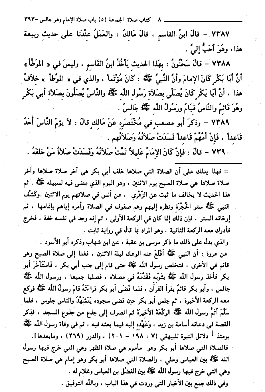 7388 - قَالَ سَحْنُونُ: بِهَذَا الْحَدِيثِ يَأْخُذُ ابْنُ الْقَاسِمِ وَلَيْسَ فِي " " الْمُوَطَّأِ " " أَنَّ أَبَا بَكْرٍ كَانَ الْإِمَامَ وَأَنَّ النَّبِيَّ - صَلَّى اللَّهُ عَلَيْهِ وَسَلَّمَ - كَانَ مُؤْتَمًّا، وَالَّذِي فِي " " الْمُوَطَّأِ " " خِلَافُ هَذَا أَنَّ أَبَا بَكْرٍ كَانَ يُصَلِّي بِصَلَاةِ رَسُولِ اللَّهِ - صَلَّى اللَّهُ عَلَيْهِ وَسَلَّمَ - وَالنَّاسُ يُصَلُّونَ بِصَلَاةِ أَبِي بَكْرٍ وَهُوَ قَائِمٌ، وَالنَّاسُ قِيَامٌ وَرَسُولُ اللَّهِ - صَلَّى اللَّهُ عَلَيْهِ وَسَلَّمَ - جَالِسٌ.