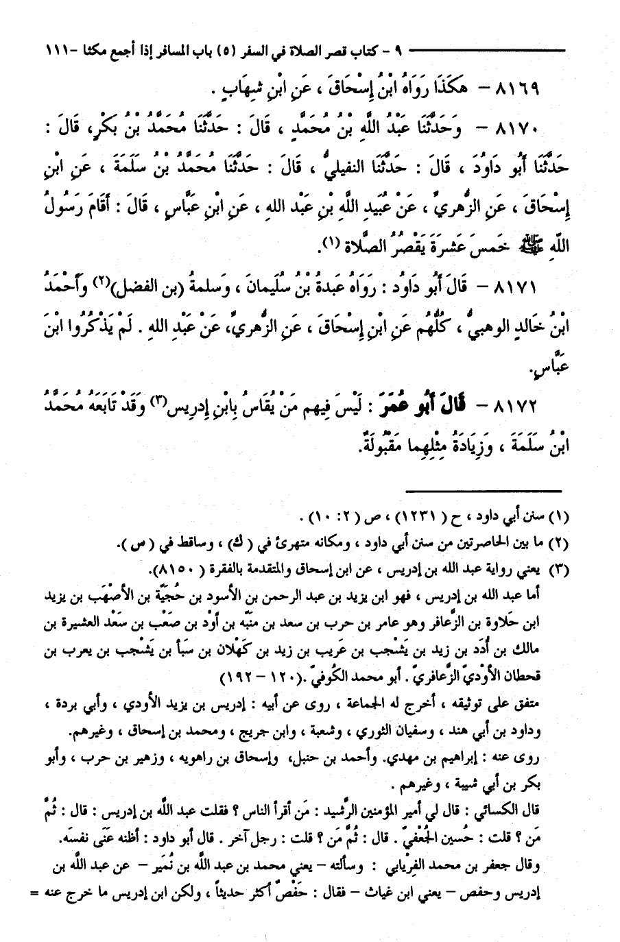 8170 - وَحَدَّثَنَا عَبْدُ اللَّهِ بْنُ مُحَمَّدٍ، قَالَ: حَدَّثَنَا مُحَمَّدُ بْنُ بَكْرٍ، قَالَ: حَدَّثَنَا أَبُو دَاوُدَ، قَالَ: حَدَّثَنَا النُّفَيْلِيُّ، قَالَ: حَدَّثَنَا مُحَمَّدُ بْنُ سَلَمَةَ، عَنِ ابْنِ إِسْحَاقَ، عَنِ الزُّهْرِيِّ، عَنْ عُبَيْدِ اللَّهِ بْنِ عَبْدِ اللَّهِ، عَنِ ابْنِ عَبَّاسٍ، قَالَ:أَقَامَ رَسُولُ اللَّهِ - صَلَّى اللَّهُ عَلَيْهِ وَسَلَّمَ - خَمْسَ عَشْرَةَ يَقْصُرُ الصَّلَاةَ.