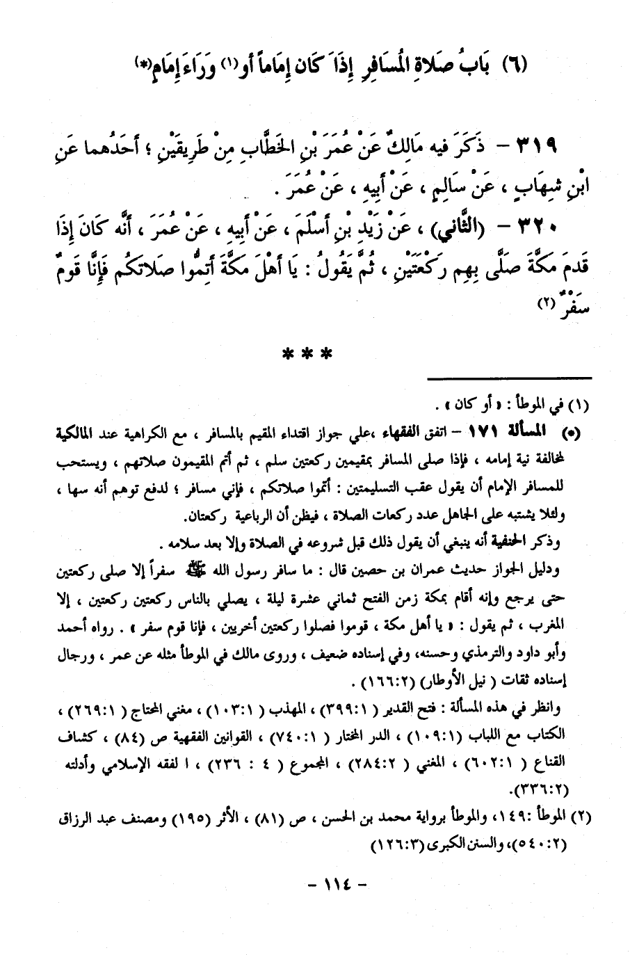 320 - ( الثَّانِي ) عَنْ زَيْدِ بْنِ أَسْلَمَ، عَنْ أَبِيهِ، عَنْ عُمَرَ، أَنَّهُ كَانَ إِذَا قَدِمَ مَكَّةَ صَلَّى بِهِمْ رَكْعَتَيْنِ، ثُمَّ يَقُولُ: يَا أَهْلَ مَكَّةَ أَتِمُّوا صَلَاتَكُمْ، فَإِنَّا قَوْمٌ سَفْرٌ.