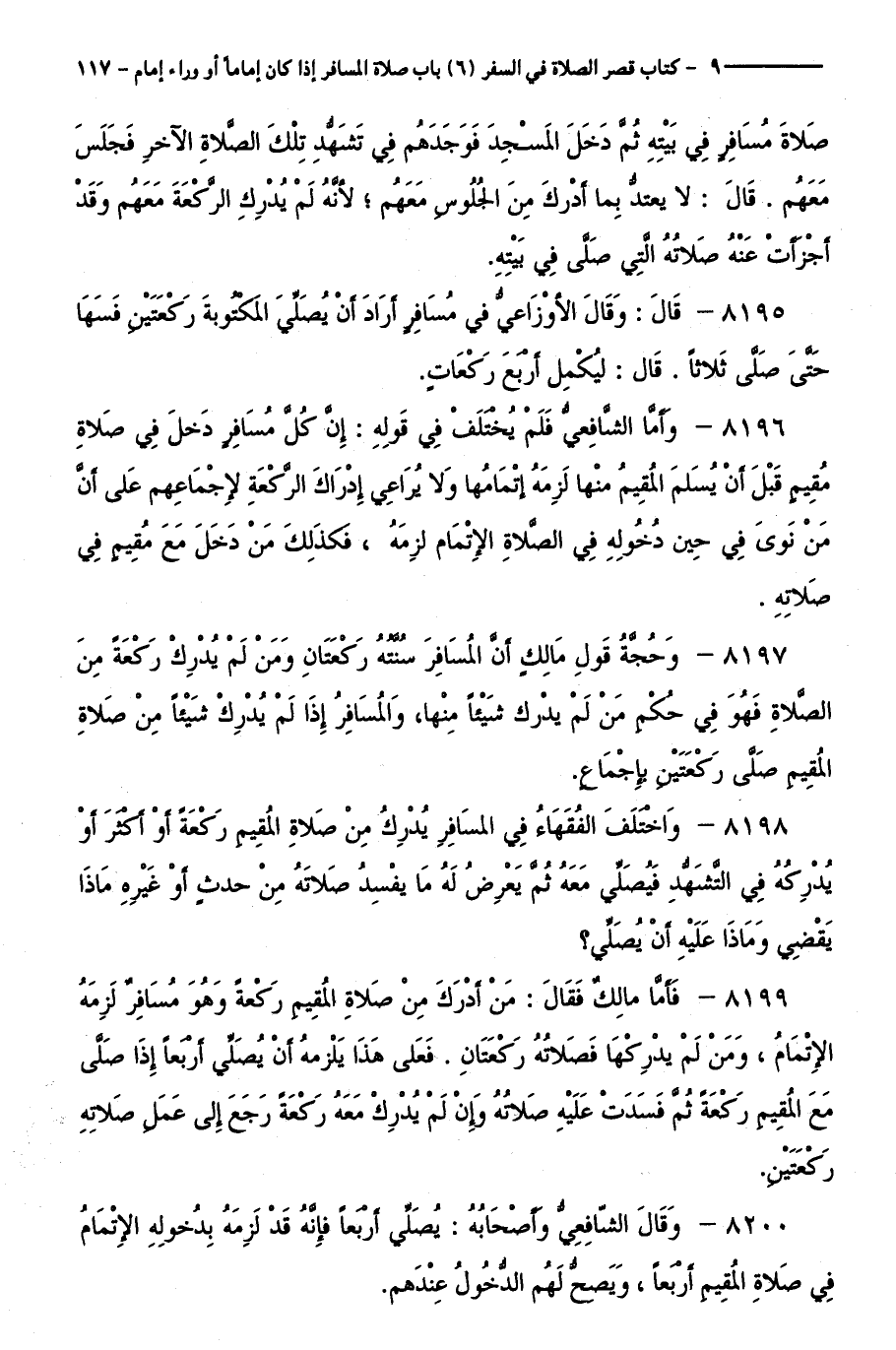 8199 - فَأَمَّا مَالِكٌ فَقَالَ: مَنْ أَدْرَكَ مِنْ صَلَاةِ الْمُقِيمِ رَكْعَةً وَهُوَ مُسَافِرٌ لَزِمَهُ الْإِتْمَامُ، وَمَنْ لَمْ يُدْرِكْهَا فَصَلَاتُهُ رَكْعَتَانِ. فَعَلَى هَذَا يَلْزَمُهُ أَنْ يُصَلِّيَ أَرْبَعًا إِذَا صَلَّى مَعَ الْمُقِيمِ رَكْعَةً ثُمَّ فَسَدَتْ عَلَيْهِ صَلَاتُهُ، وَإِنْ لَمْ يُدْرِكْ مَعَهُ رَكْعَةً رَجَعَ إِلَى عَمَلِ صَلَاتِهِ رَكْعَتَيْنِ.