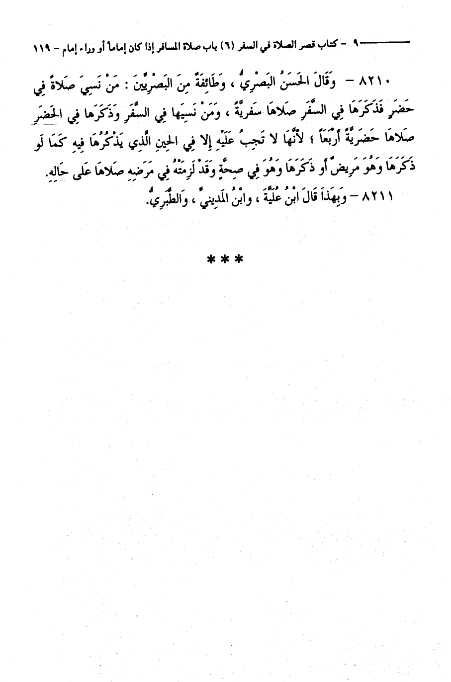 8210 - وَقَالَ الْحَسَنُ الْبَصْرِيُّ، وَطَائِفَةٌ مِنَ الْبَصْرِيِّينَ: مَنْ نَسِيَ صَلَاةً فِي حَضَرٍ فَذَكَرَهَا فِي السَّفَرِ صَلَّاهَا سَفَرِيَّةً، وَمَنْ نَسِيَهَا فِي السَّفَرِ وَذَكَرَهَا فِي الْحَضَرِ صَلَّاهَا حَضَرِيَّةً أَرْبَعًا ; لِأَنَّهَا لَا تَجِبُ عَلَيْهِ إِلَّا فِي الْحِينِ الَّذِي يَذْكُرُهَا فِيهِ، كَمَا لَوْ ذَكَرَهَا وَهُوَ مَرِيضٌ، أَوْ ذَكَرَهَا وَهُوَ فِي صِحَّةٍ وَقَدْ لَزِمَتْهُ فِي مَرَضِهِ صَلَّاهَا عَلَى حَالِهِ.