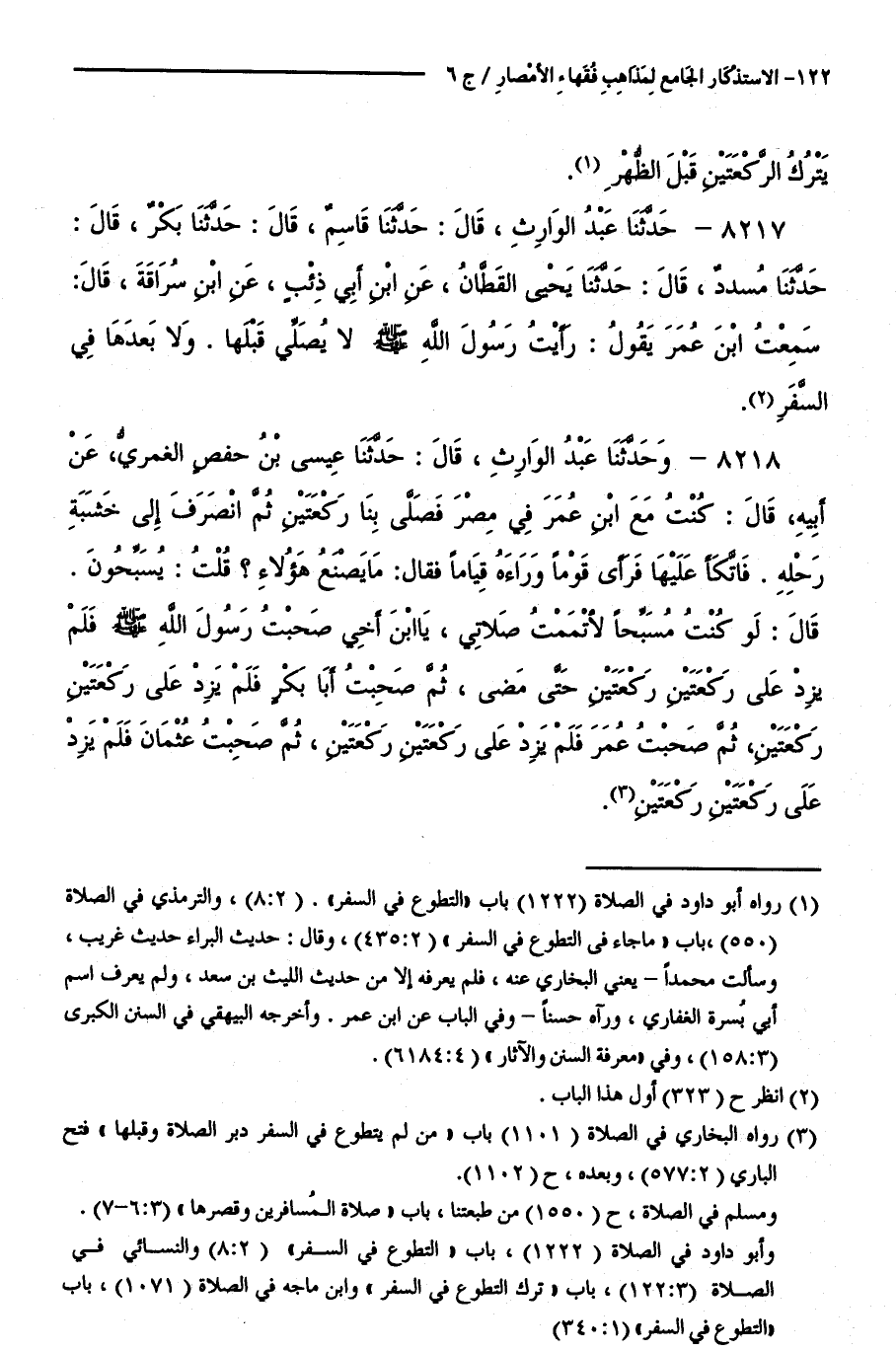 8217 - حَدَّثَنَا عَبْدُ الْوَارِثِ، قَالَ: حَدَّثَنَا قَاسِمٌ، قَالَ: حَدَّثَنَا بَكْرٌ، قَالَ: حَدَّثَنَا مُسَدَّدٌ، قَالَ: حَدَّثَنَا يَحْيَى الْقَطَّانُ، عَنِ ابْنِ أَبِي ذِئْبٍ، عَنِ ابْنِ سِرَاقَةَ، قَالَ: سَمِعْتُ ابْنَ عُمَرَ يَقُولُ:رَأَيْتُ رَسُولَ اللَّهِ - صَلَّى اللَّهُ عَلَيْهِ وَسَلَّمَ - لَا يُصَلِّي قَبْلَهَا وَلَا بَعْدَهَا فِي السَّفَرِ.