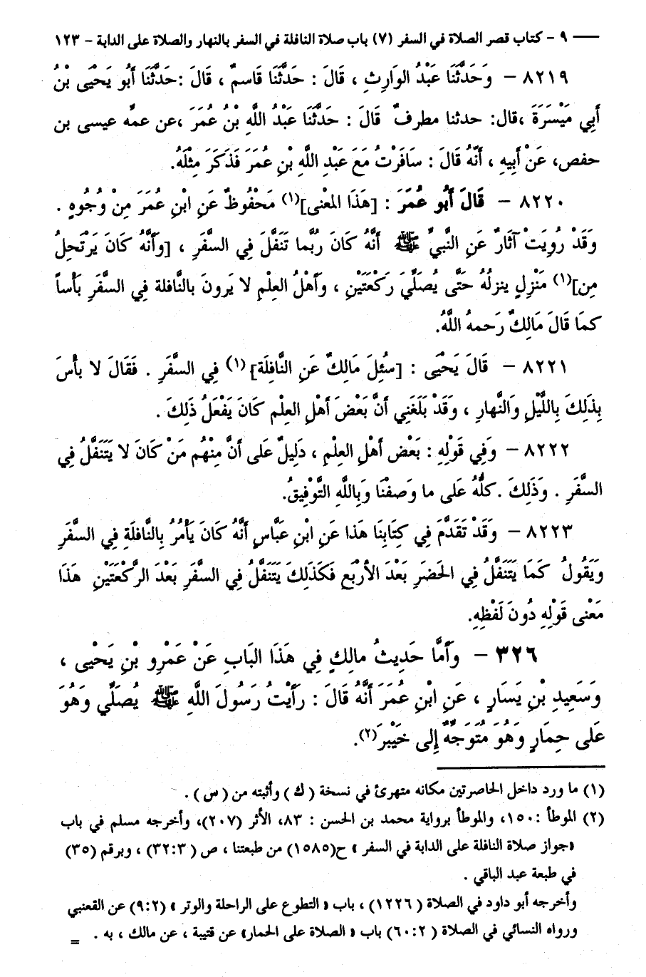 8221 - قَالَ يَحْيَى: سُئِلَ مَالِكٌ عَنِ النَّافِلَةِ فِي السَّفَرِ، فَقَالَ: لَا بَأْسَ بِذَلِكَ بِاللَّيْلِ وَالنَّهَارِ، وَقَدْ بَلَغَنِي أَنَّ بَعْضَ أَهْلِ الْعِلْمِ كَانَ يَفْعَلُ ذَلِكَ.