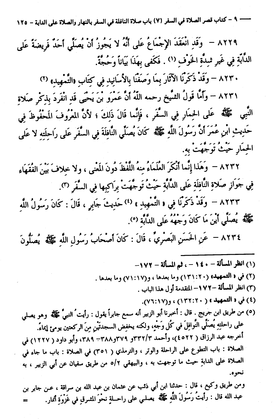 8233 - وَقَدْ ذَكَرْنَا فِي التَّمْهِيدِ حَدِيثَ جَابِرٍ، قَالَ:كَانَ رَسُولُ اللَّهِ - صَلَّى اللَّهُ عَلَيْهِ وَسَلَّمَ - يُصَلِّي أَيْنَ مَا كَانَ وَجْهُهُ عَلَى الدَّابَّةِ.