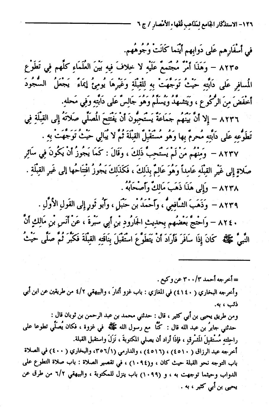 8236 - إِلَّا أَنَّ بَيْنَهُمْ جَمَاعَةً يَسْتَحِبُّونَ أَنْ يَفْتَتِحَ الْمُصَلِّي صَلَاتَهُ إِلَى الْقِبْلَةِ فِي تَطَوُّعِهِ عَلَى دَابَّتِهِ مُحْرِمٌ بِهَا وَهُوَ مُسْتَقْبَلٌ الْقِبْلَةَ، ثُمَّ لَا يُبَالِي حَيْثُ تَوَجَّهَتْ بِهِ.