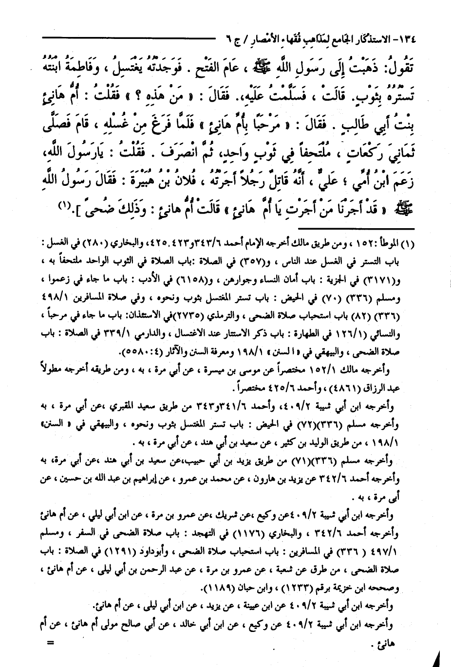 تَقُولُ:ذَهَبْتُ إِلَى رَسُولِ اللَّهِ - صَلَّى اللَّهُ عَلَيْهِ وَسَلَّمَ - عَامَ الْفَتْحِ، فَوَجَدْتُهُ يَغْتَسِلُ، وَفَاطِمَةُ ابْنَتُهُ تَسْتُرُهُ بِثَوْبٍ. قَالَتْ: فَسَلَّمْتُ عَلَيْهِ، فَقَالَ: مَنْ هَذِهِ ؟ فَقُلْتُ: أُمُّ هَانِئِ بِنْتُ أَبِي طَالِبٍ. فَقَالَ: مَرْحَبًا " بِأُمِّ هَانِئٍ " فَلَمَّا فَرَغَ مِنْ غُسْلِهِ، قَامَ فَصَلَّى ثَمَانِيَ رَكَعَاتٍ مُلْتَحِفًا فِي ثَوْبٍ وَاحِدٍ، ثُمَّ انْصَرَفَ. فَقُلْتُ: يَا رَسُولَ اللَّهِ زَعَمَ ابْنُ أُمِّي ; عَلِيٌّ، أَنَّهُ قَاتِلٌ رَجُلًا أَجَرْتُهُ، فُلَانُ بْنُ هُبَيْرَةَ، فَقَالَ رَسُولُ اللَّهِ - صَلَّى اللَّهُ عَلَيْهِ وَسَلَّمَ -: قَدْ أَجَرْنَا مَنْ أَجَرْتِ يَا أُمَّ هَانِئٍ، قَالَتْ أُمُّ هَانِئٍ: وَذَلِكَ ضُحًى.