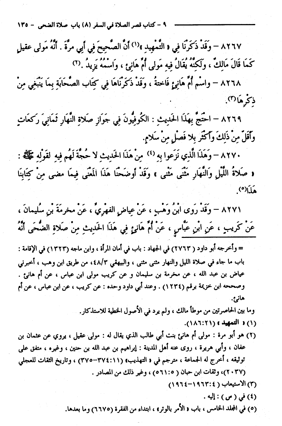 8269 - احْتَجَّ بِهَذَا الْحَدِيثِ: الْكُوفِيُّونَ فِي جَوَازِ صَلَاةِ النَّهَارِ ثَمَانِيَ رَكَعَاتٍ، وَأَقَلَّ مِنْ ذَلِكَ وَأَكْثَرَ بِلَا فَصْلٍ مِنْ سَلَامٍ.