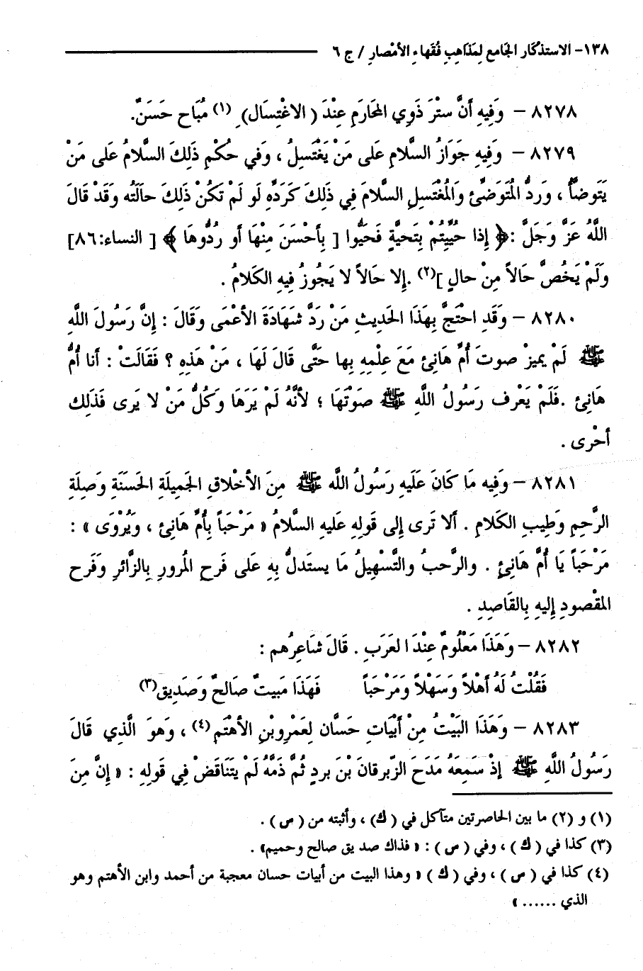 8279 - وَفِيهِ جَوَازُ السَّلَامِ عَلَى مَنْ يَغْتَسِلُ، وَفِي حُكْمِ ذَلِكَ السَّلَامُ عَلَى مَنْ يَتَوَضَّأُ، وَرَدُّ الْمُتَوَضِّئِ وَالْمُغْتَسِلِ السَّلَامَ فِي ذَلِكَ كَرَدِّهِ لَوْ لَمْ تَكُنْ ذَلِكَ حَالَتُهُ، وَقَدْ قَالَ اللَّهُ - عَزَّ وَجَلَّ -: "وَإِذَا حُيِّيتُمْ بِتَحِيَّةٍ فَحَيُّوا بِأَحْسَنَ مِنْهَا أَوْ رُدُّوهَا " [ النِّسَاءِ: 86 ] وَلَمْ يَخُصَّ حَالًا مِنْ حَالٍ. إِلَّا حَالًا لَا يَجُوزُ فِيهِ الْكَلَامُ.