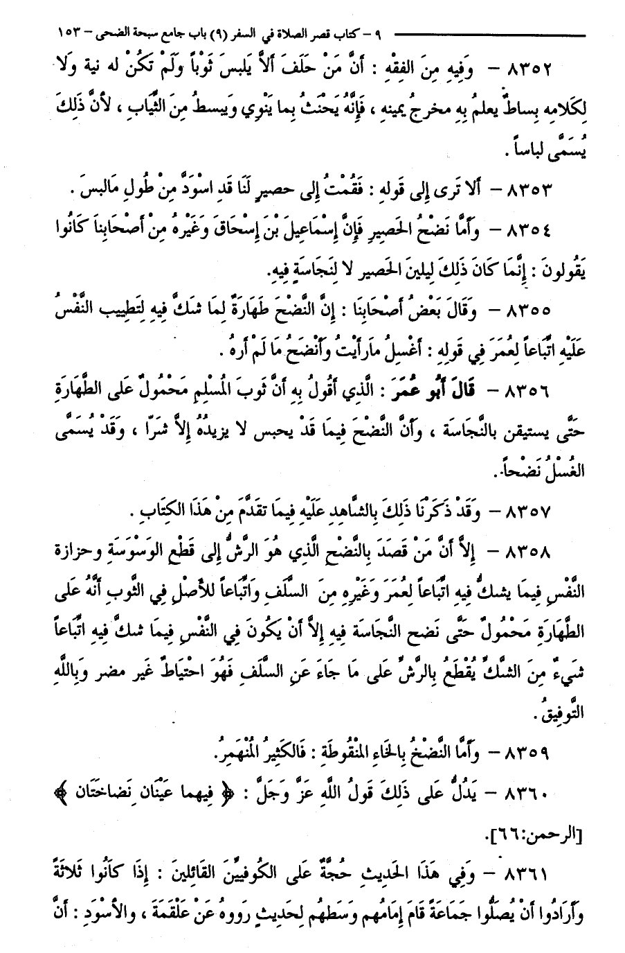 8358 - إِلَّا أَنَّ مَنْ قَصَدَ بِالنَّضْحِ - الَّذِي هُوَ الرَّشُّ - إِلَى قَطْعِ الْوَسْوَسَةِ، وَحَزَازَةِ النَّفْسِ فِيمَا يُشَكُّ فِيهِ، اتِّبَاعًا لِعُمَرَ وَغَيْرِهِ مِنَ السَّلَفِ، وَاتِّبَاعًا لِلْأَصْلِ فِي الثَّوْبِ أَنَّهُ عَلَى الطَّهَارَةِ مَحْمُولٌ حَتَّى تَصِحَّ النَّجَاسَةُ فِيهِ، إِلَّا أَنْ يَكُونَ فِي النَّفْسِ فِيمَا شَكَّ فِيهِ اتِّبَاعًا شَيْءٌ مِنَ الشَّكِّ يَقْطَعُ بِالرَّشِّ عَلَى مَا جَاءَ عَنِ السَّلَفِ، فَهُوَ احْتِيَاطٌ غَيْرُ مُضِرٍّ وَبِاللَّهِ التَّوْفِيقُ.
