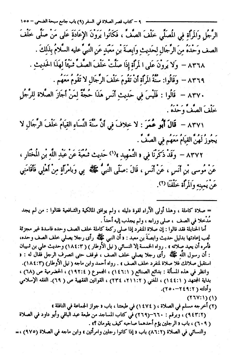 8371 - قَالَ أَبُو عُمَرَ: لَا خِلَافَ فِي أَنَّ سُنَّةَ النِّسَاءِ الْقِيَامُ خَلْفَ الرِّجَالِ، لَا يَجُوزُ لَهُنَّ الْقِيَامُ مَعَهُمْ فِي الصَّفِّ.