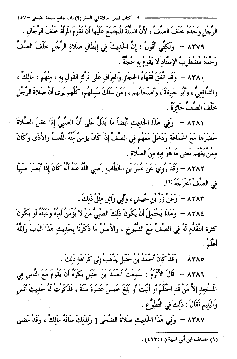8386 - قَالَ الْأَثْرَمُ: سَمِعْتُ أَحْمَدَ بْنَ حَنْبَلٍ يَكْرَهُ أَنْ يَقُومَ مَعَ النَّاسِ فِي الْمَسْجِدِ إِلَّا مَنْ قَدِ احْتَلَمَ أَوْ أَنْبَتَ أَوْ بَلَغَ خَمْسَ عَشْرَةَ سَنَةَ، فَذَكَرْتُ لَهُ حَدِيثَ أَنَسٍ وَالْيَتِيمِ فَقَالَ: ذَلِكَ فِي التَّطَوُّعِ.