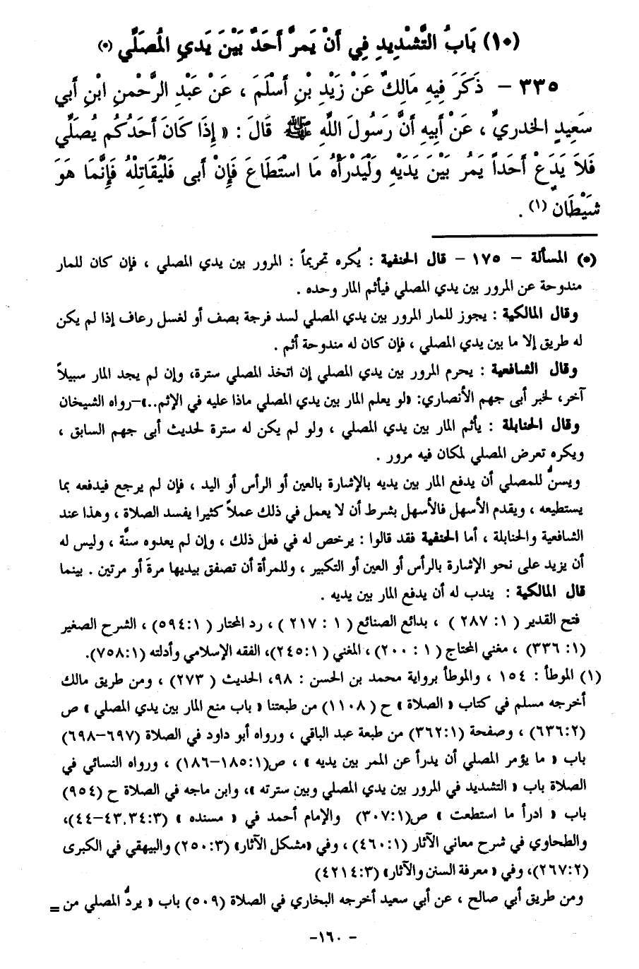 335 - ذَكَرَ فِيهِ مَالِكٌ، عَنْ زَيْدِ بْنِ أَسْلَمَ، عَنْ عَبْدِ الرَّحْمَنِ بْنِ أَبِي سَعِيدٍ الْخُدْرِيِّ، عَنْ أَبِيهِ أَنَّ رَسُولَ اللَّهِ - صَلَّى اللَّهُ عَلَيْهِ وَسَلَّمَ - قَالَ: "إِذَا كَانَ أَحَدُكُمْ يُصَلِّي فَلَا يَدَعُ أَحَدًا يَمُرُّ بَيْنَ يَدَيْهِ وَلِيَدْرَأْهُ مَا اسْتَطَاعَ فَإِنْ أَبَى فَلْيُقَاتِلْهُ ; فَإِنَّمَا هُوَ شَيْطَانٌ.