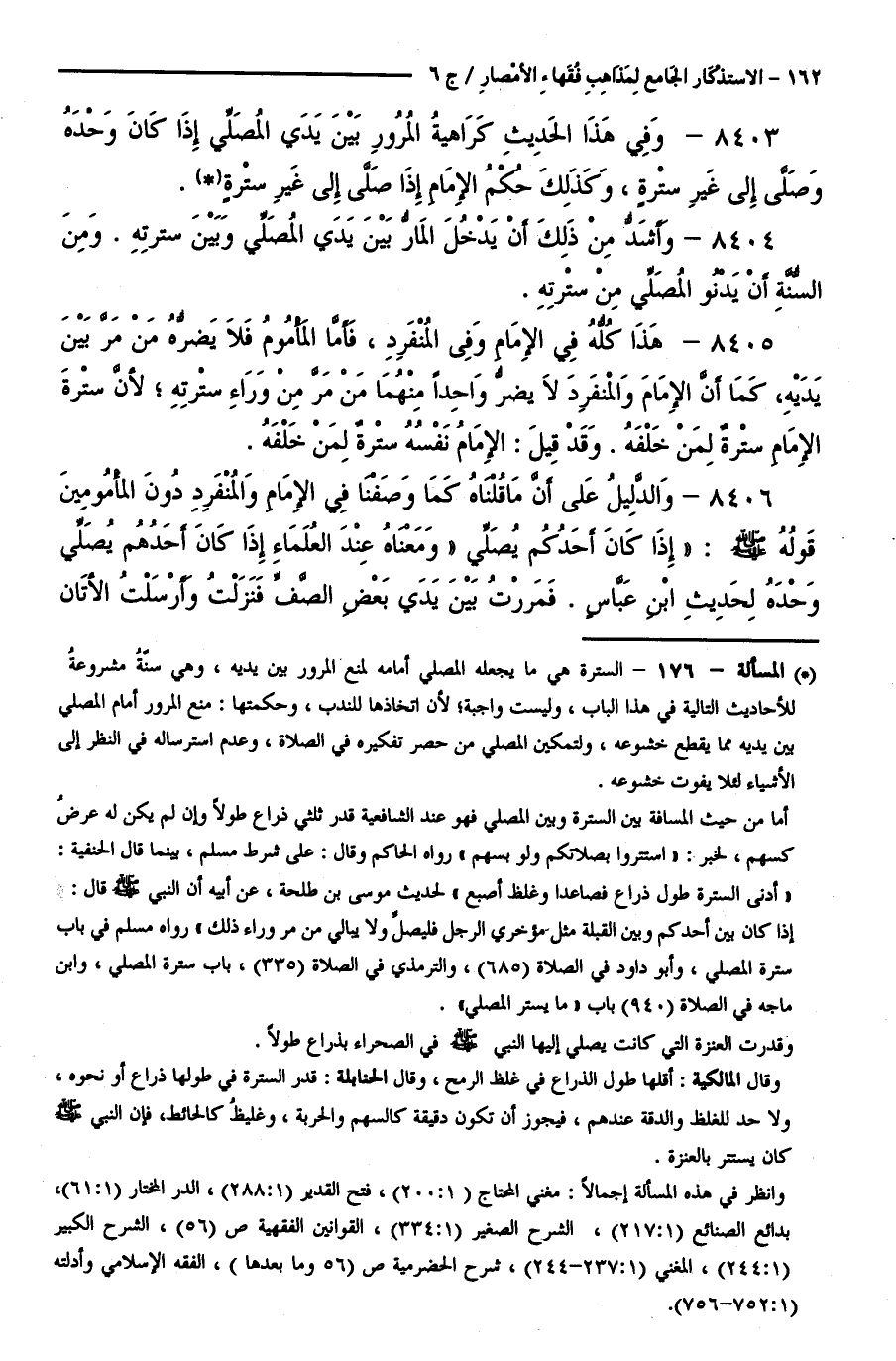 8405 - هَذَا كُلُّهُ فِي الْإِمَامِ وَفِي الْمُنْفَرِدِ، فَأَمَّا الْمَأْمُومُ فَلَا يَضُرُّهُ مَنْ مَرَّ بَيْنَ يَدَيْهِ، كَمَا أَنَّ الْإِمَامَ وَالْمُنْفَرِدَ لَا يَضُرُّ وَاحِدًا مِنْهُمَا مَنْ مَرَّ مِنْ وَرَاءِ سُتْرَتِهِ ; لِأَنَّ سُتْرَةَ الْإِمَامِ سُتْرَةٌ لِمَنْ خَلْفَهُ. وَقَدْ قِيلَ: الْإِمَامُ نَفْسُهُ سُتْرَةٌ لِمَنْ خَلْفَهُ.