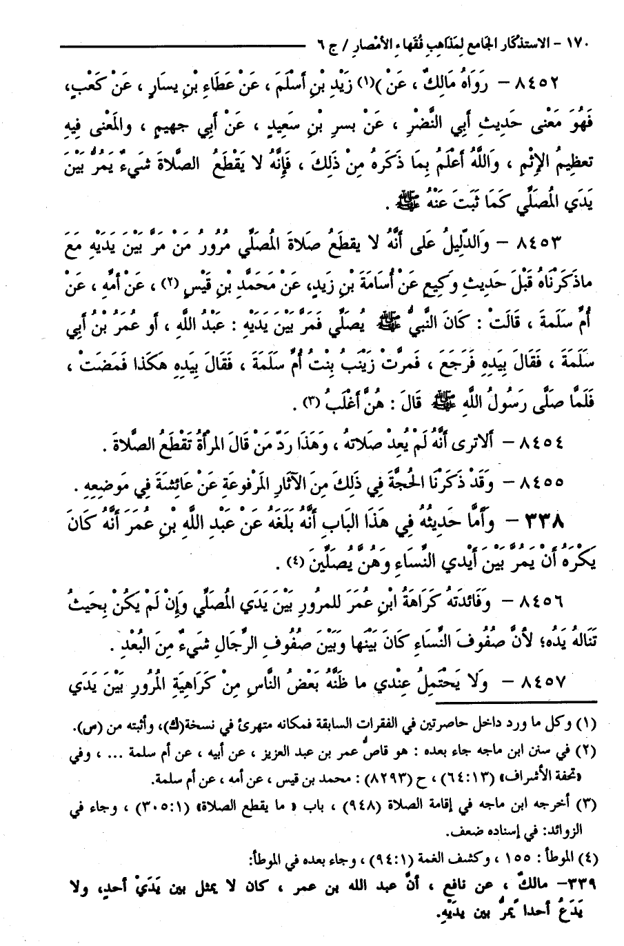 8452 - رَوَاهُ مَالِكٌ، عَنْ زَيْدِ بْنِ أَسْلَمَ، عَنْ عَطَاءِ بْنِ يَسَارٍ، عَنْ كَعْبٍ، فَهُوَ مَعْنَى حَدِيثِ أَبِي النَّضْرِ، عَنْ بُسْرِ بْنِ سَعِيدٍ، عَنْ أَبِي جُهَيْمٍ، وَالْمَعْنَى فِيهِ تَعْظِيمُ الْإِثْمِ، وَاللَّهُ أَعْلَمُ بِمَا ذَكَرَهُ مِنْ ذَلِكَ، فَإِنَّهُ لَا يَقْطَعُ الصَّلَاةَ شَيْءٌ يَمُرُّ بَيْنَ يَدَيِ الْمُصَلِّي كَمَا ثَبَتَ عَنْهُ - صَلَّى اللَّهُ عَلَيْهِ وَسَلَّمَ -.