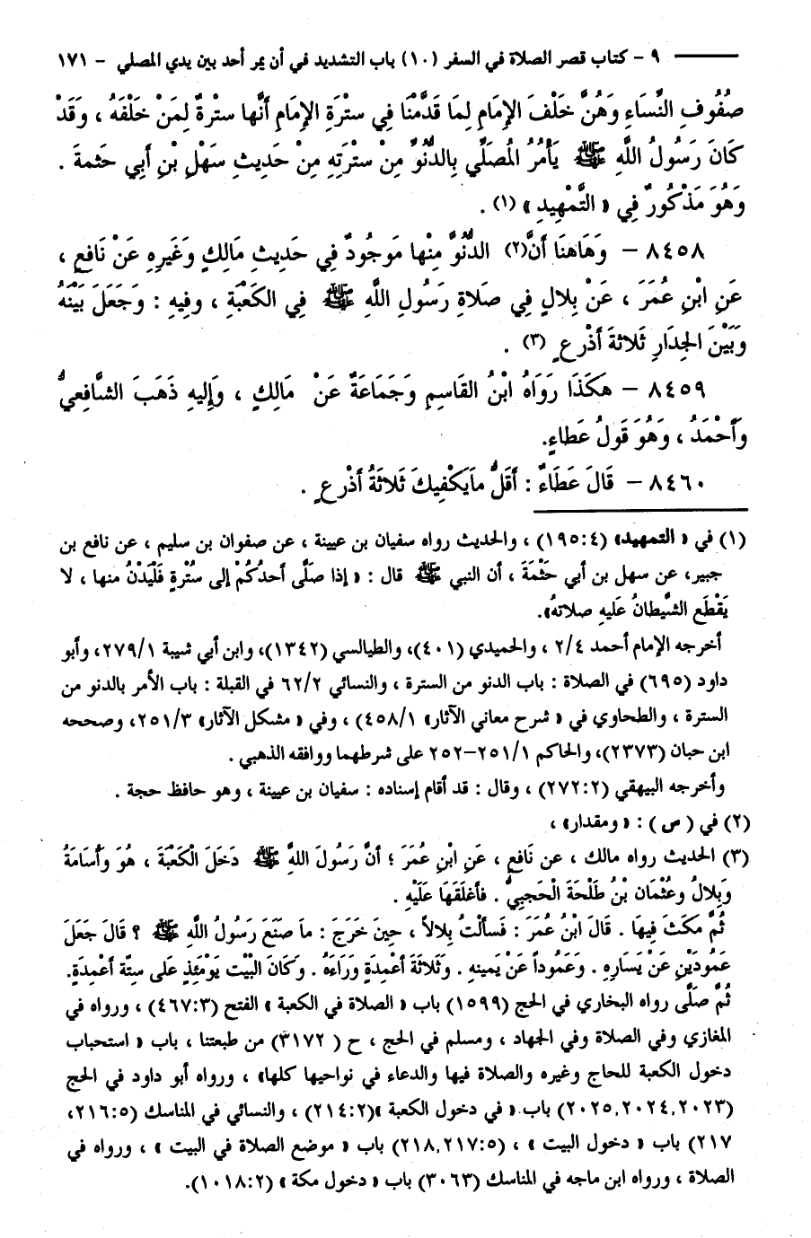 8458 - وَهَاهُنَا أَنَّ الدُّنُوَّ مِنْهَا مَوْجُودٌ فِي حَدِيثِ مَالِكٍ وَغَيْرِهِ عَنْ نَافِعٍ، عَنِ ابْنِ عُمَرَ، عَنْ بِلَالٍ فِي صَلَاةِ رَسُولِ اللَّهِ - صَلَّى اللَّهُ عَلَيْهِ وَسَلَّمَ - فِي الْكَعْبَةِ، وَفِيهِ:وَجَعَلَ بَيْنَهُ وَبَيْنَ الْجِدَارِ ثَلَاثَةَ أَذْرُعٍ.