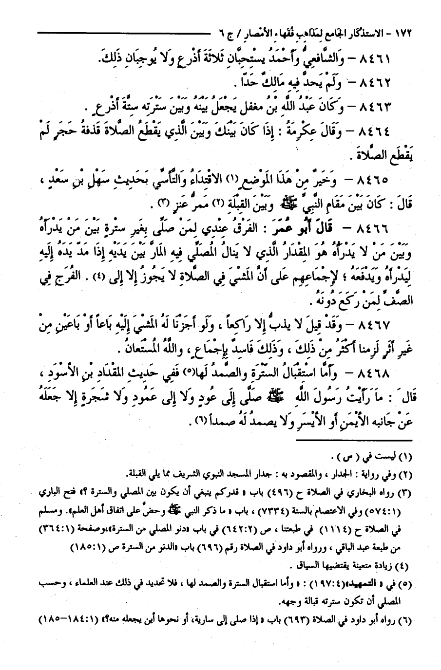 8463 - وَكَانَ عَبْدُ اللَّهِ بْنُ مُغَفَّلٍ يَجْعَلُ بَيْنَهُ وَبَيْنَ سُتْرَتِهِ سِتَّةَ أَذْرُعٍ.
