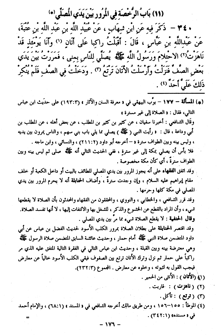340 - ذُكِرَ فِيهِ عَنِ ابْنِ شِهَابٍ، عَنْ عُبَيْدِ اللَّهِ بْنِ عَبْدِ اللَّهِ بْنِ عُتْبَةَ،عَنْ عَبْدِ اللَّهِ بْنِ عَبَّاسٍ، قَالَ: أَقْبَلْتُ رَاكِبًا عَلَى أَتَانٍ، وَأَنَا يَوْمَئِذٍ قَدْ نَاهَزْتُ الِاحْتِلَامَ، وَرَسُولُ اللَّهِ يُصَلِّي لِلنَّاسِ بِمِنًى، فَمَرَرْتُ بَيْنَ يَدَيْ بَعْضِ الصَّفِّ فَنَزَلْتُ وَأَرْسَلْتُ الْأَتَانَ تَرْتَعُ، وَدَخَلْتُ فِي الصَّفِّ، فَلَمْ يُنْكِرْ ذَلِكَ عَلَيَّ أَحَدٌ.