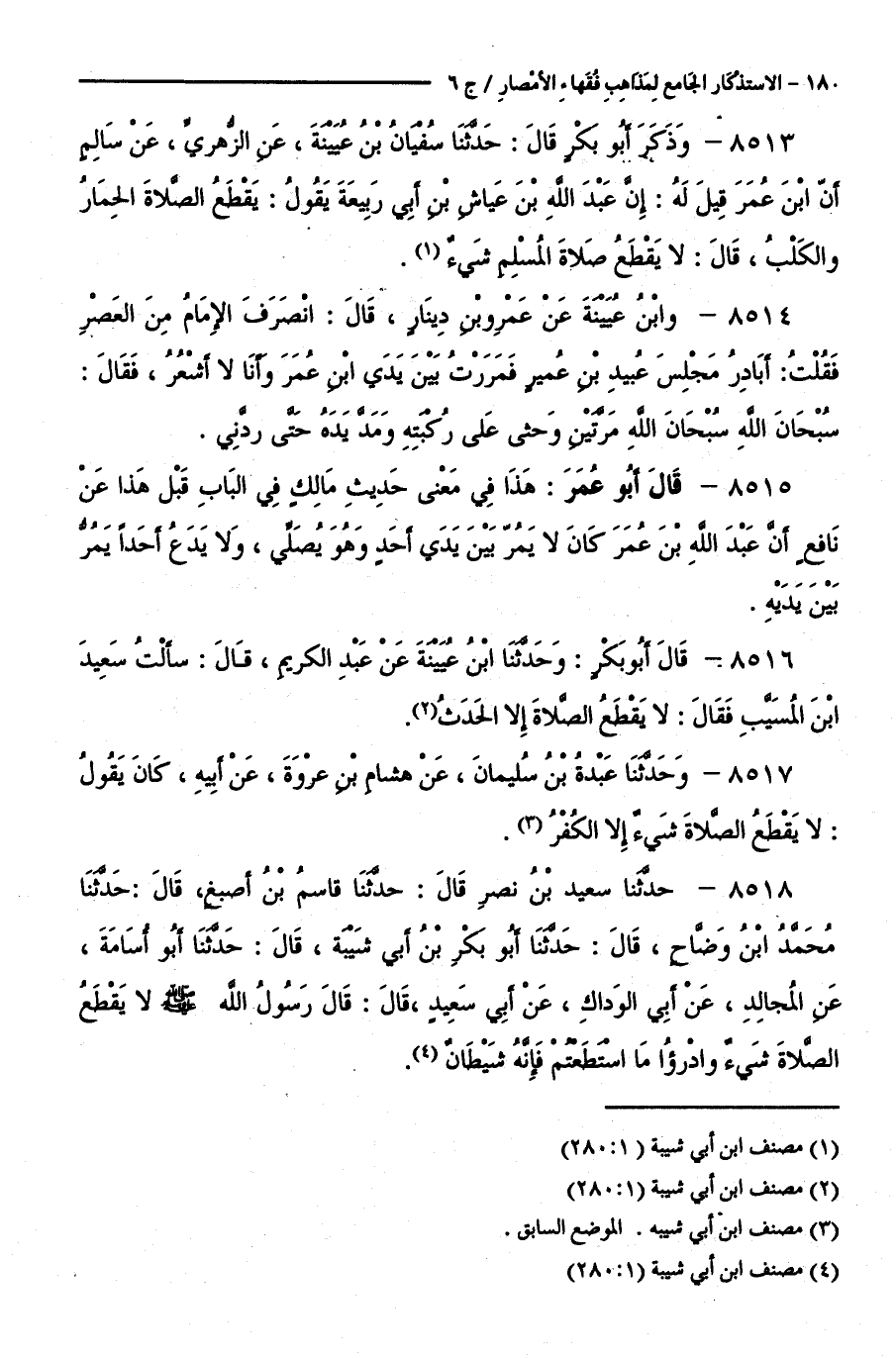 8516 - قَالَ أَبُو بَكْرٍ: وَحَدَّثَنَا ابْنُ عُيَيْنَةَ عَنْ عَبْدِ الْكَرِيمِ، قَالَ: سَأَلْتُ سَعِيدَ بْنَ الْمُسَيَّبِ فَقَالَ: لَا يَقْطَعُ الصَّلَاةَ إِلَّا الْحَدَثُ.