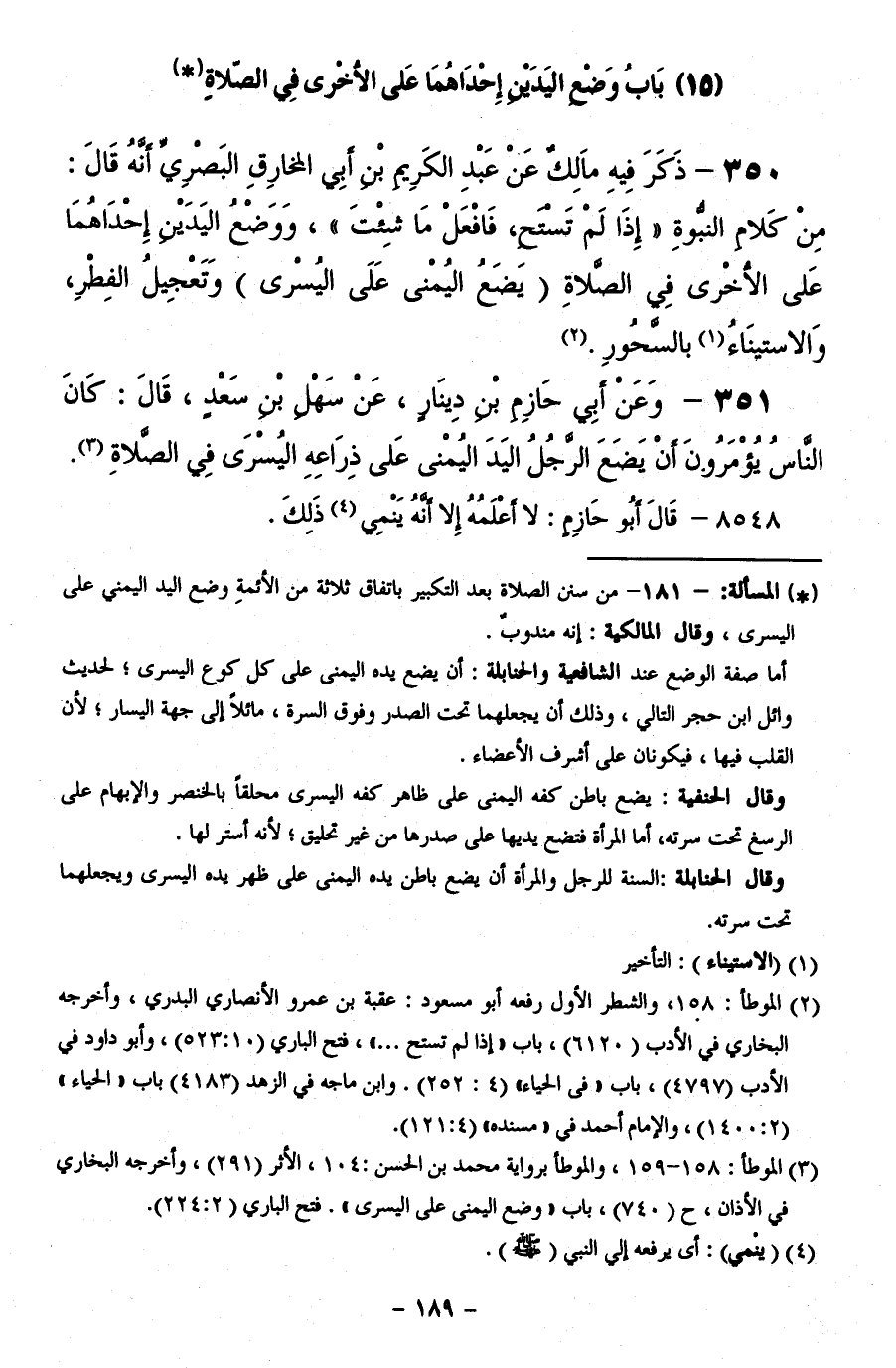 350 - ذَكَرَ فِيهِ مَالِكٌ عَنْ عَبْدِ الْكَرِيمِ بْنِ أَبِي الْمُخَارِقِ الْبَصَرِيِّ أَنَّهُ قَالَ: مِنْ كَلَامِ النُّبُوَّةِ " إِذَا لَمْ تَسْتَحِ، فَافْعَلْ مَا شِئْتَ "، وَوَضْعُ الْيَدَيْنِ إِحْدَاهُمَا عَلَى الْأُخْرَى فِي الصَّلَاةِ ( يَضَعُ الْيُمْنَى عَلَى الْيُسْرَى )، وَتَعْجِيلُ الْفِطْرِ، وَالِاسْتِينَاءُ بِالسَّحُورِ.