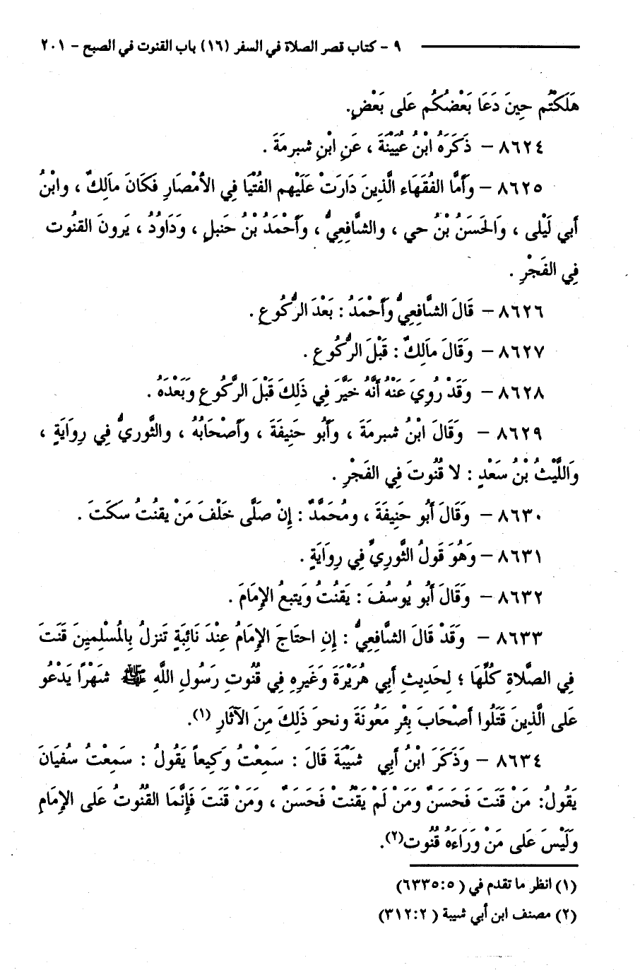 8625 - وَأَمَّا الْفُقَهَاءُ الَّذِينَ دَارَتْ عَلَيْهِمُ الْفُتْيَا فِي الْأَمْصَارِ فَكَانَ مَالِكٌ، وَابْنُ أَبِي لَيْلَى، وَالْحَسَنُ بْنُ حَيٍّ، وَالشَّافِعِيُّ، وَأَحْمَدُ بْنُ حَنْبَلٍ، وَدَاوُدُ، يَرَوْنَ الْقُنُوتَ فِي الْفَجْرِ.