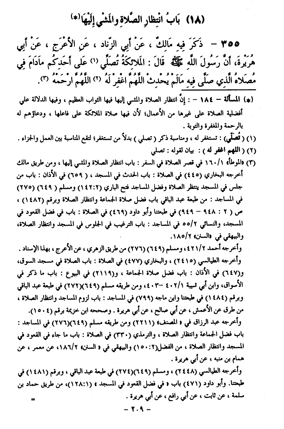 355 - ذَكَرَ فِيهِ مَالِكٌ، عَنْ أَبِي الزِّنَادِ، عَنِ الْأَعْرَجِ، عَنْ أَبِي هُرَيْرَةَ، أَنَّ رَسُولَ اللَّهِ - صَلَّى اللَّهُ عَلَيْهِ وَسَلَّمَ - قَالَ:الْمَلَائِكَةُ تُصَلِّي عَلَى أَحَدِكُمْ مَا دَامَ فِي مُصَلَّاهُ الَّذِي صَلَّى فِيهِ مَا لَمْ يُحْدِثِ: اللَّهُمَّ اغْفِرْ لَهُ اللَّهُمَّ ارْحَمْهُ.
