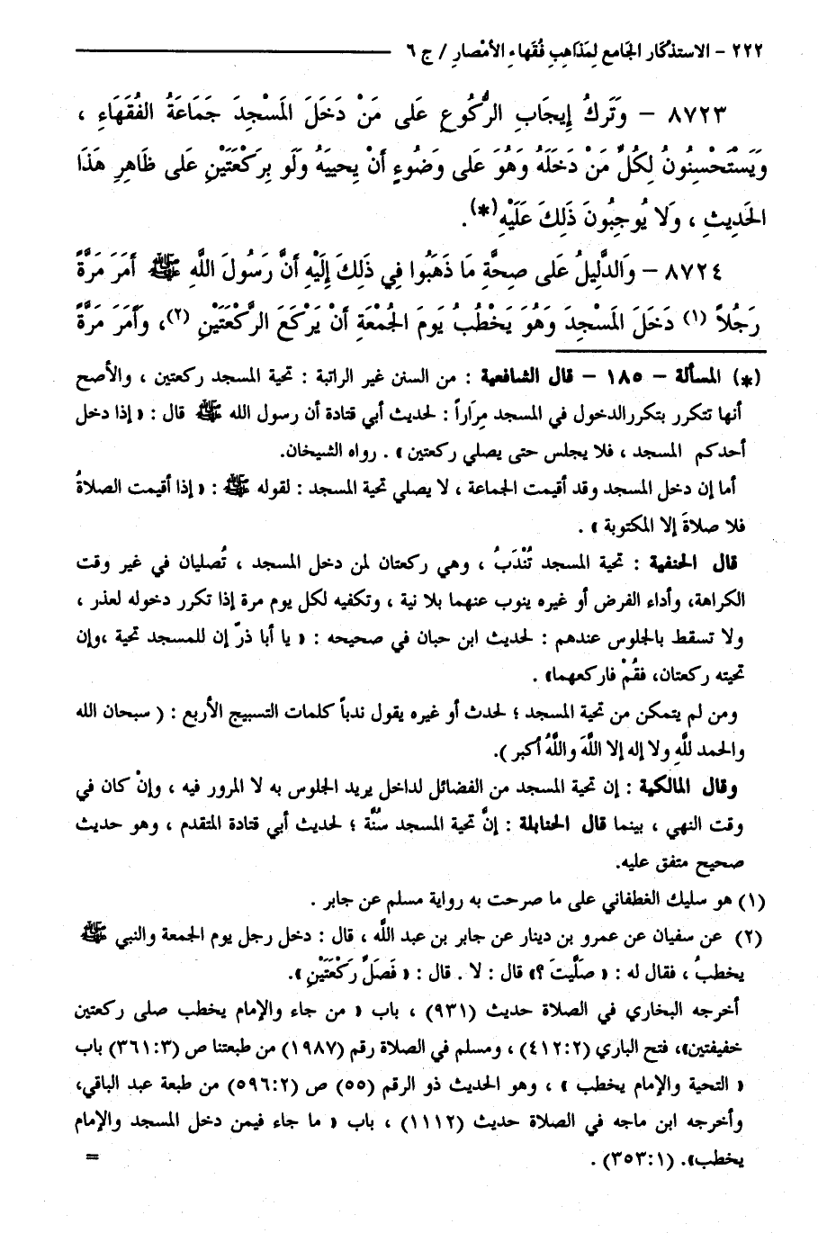 8723 - وَتَرَكَ إِيجَابَ الرُّكُوعِ عَلَى مَنْ دَخَلَ الْمَسْجِدَ جَمَاعَةُ الْفُقَهَاءِ، وَيَسْتَحْسِنُونَ لِكُلِّ مَنْ دَخَلَهُ وَهُوَ عَلَى وُضُوءٍ أَنْ يُحَيِّيَهُ وَلَوْ بِرَكْعَتَيْنِ عَلَى ظَاهِرِ هَذَا الْحَدِيثِ، وَلَا يُوجِبُونَ ذَلِكَ عَلَيْهِ.