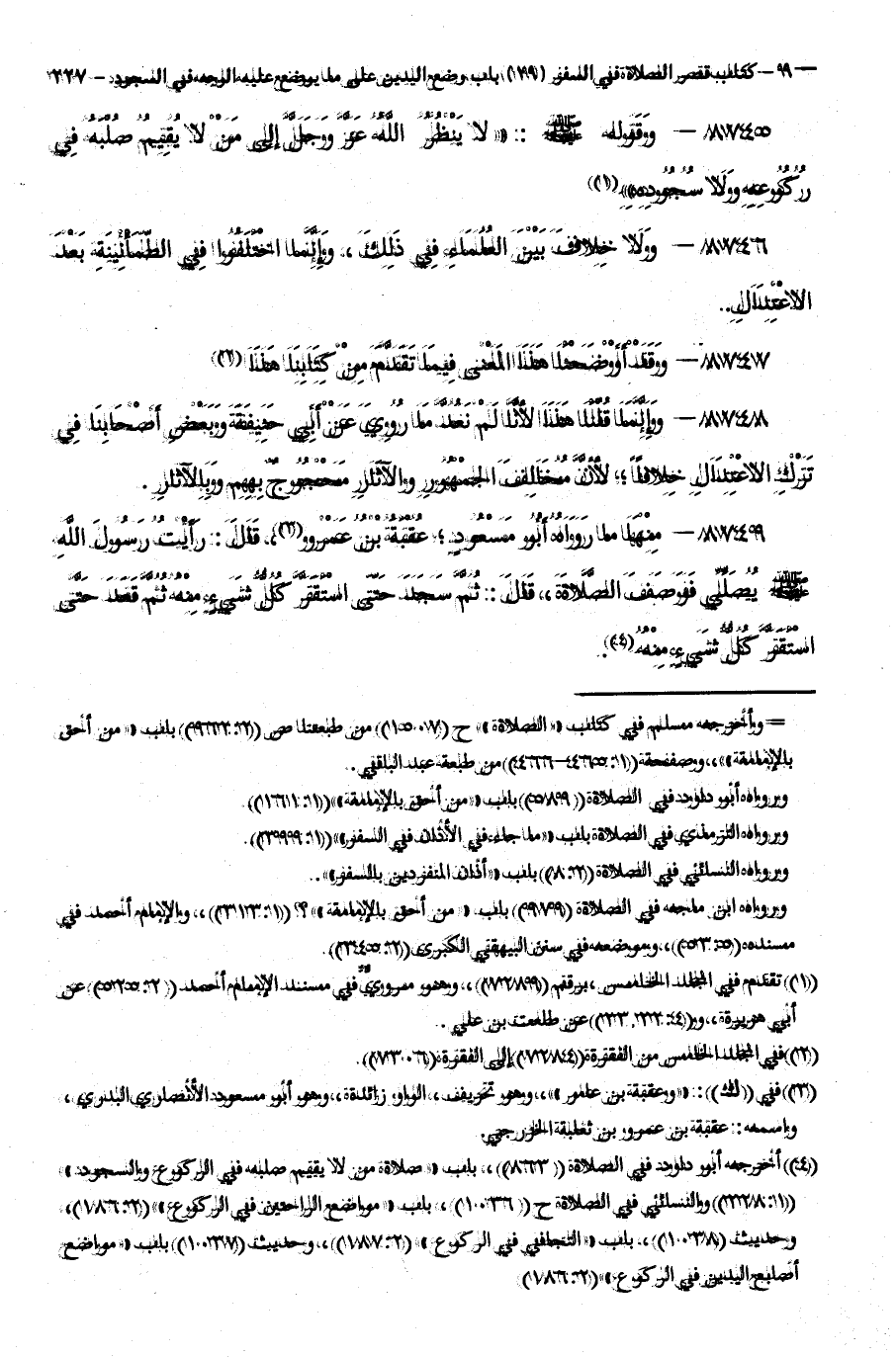 8749 - مِنْهَا مَا رَوَاهُ أَبُو مَسْعُودٍ عُقْبَةُ بْنُ عَمْرٍو قَالَ:رَأَيْتُ رَسُولَ اللَّهِ - صَلَّى اللَّهُ عَلَيْهِ وَسَلَّمَ - يُصَلِّي فَوَصَفَ الصَّلَاةَ، قَالَ: ثُمَّ سَجَدَ حَتَّى اسْتَقَرَّ كُلُّ شَيْءٍ مِنْهُ، ثُمَّ قَعَدَ حَتَّى اسْتَقَرَّ كُلُّ شَيْءٍ مِنْهُ.