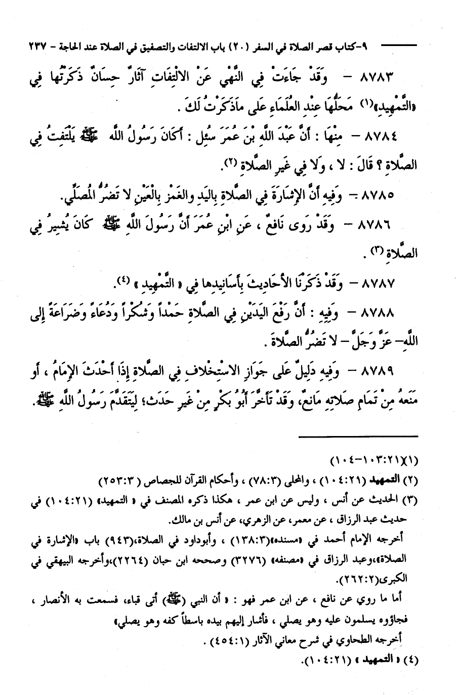 8783 - وَقَدْ جَاءَتْ فِي النَّهْيِ عَنِ الِالْتِفَاتِ آثَارٌ حِسَانٌ ذَكَرْتُهَا فِي التَّمْهِيدِ، مَحَلُّهَا عِنْدَ الْعُلَمَاءِ عَلَى مَا ذَكَرْتُ لَكَ.