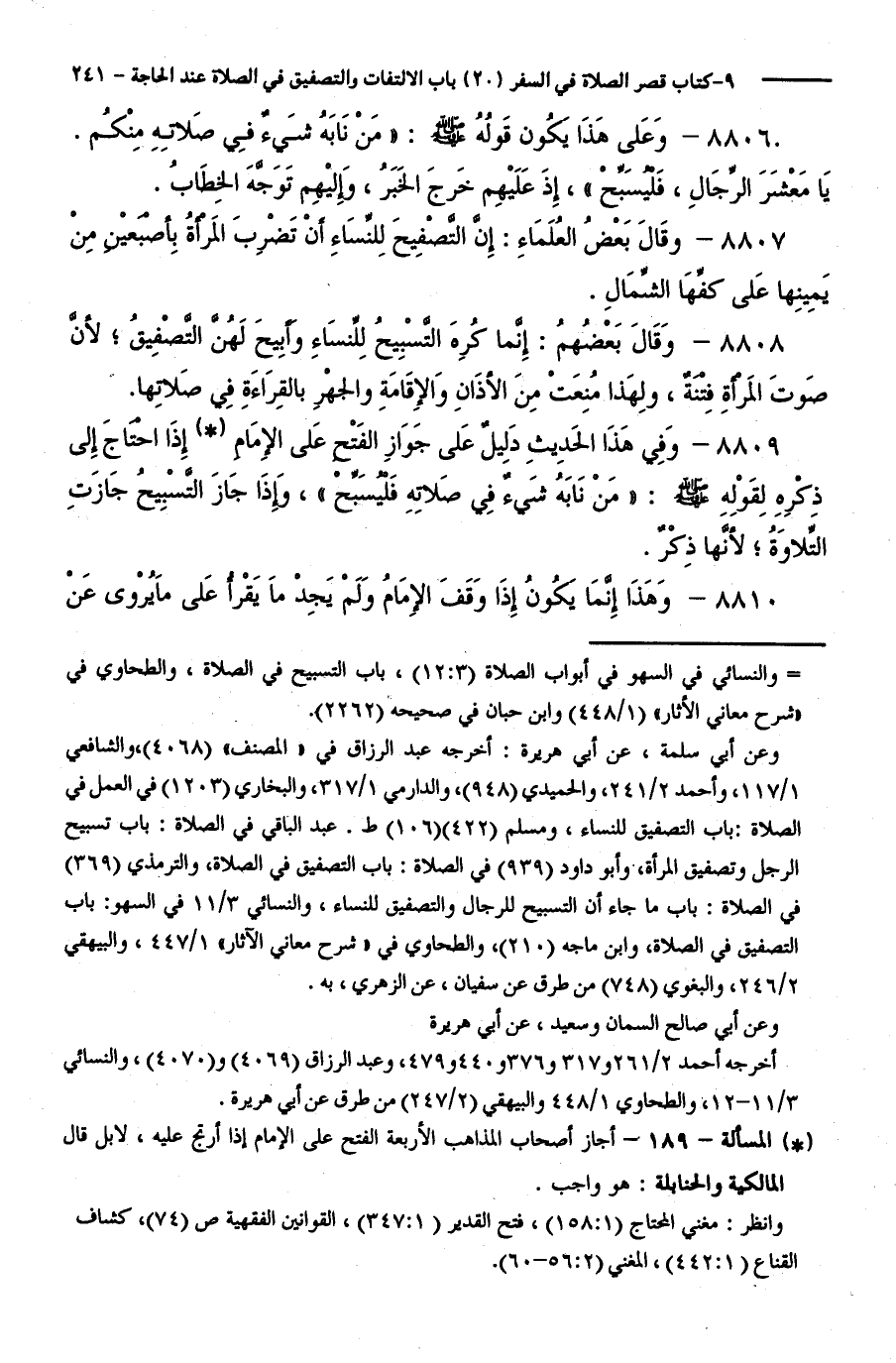 8806 - وَعَلَى هَذَا يَكُونُ قَوْلُهُ - صَلَّى اللَّهُ عَلَيْهِ وَسَلَّمَ - "مَنْ نَابَهُ شَيْءٌ فِي صَلَاتِهِ مِنْكُمْ - يَا مَعْشَرَ الرِّجَالِ - فَلْيُسَبِّحْ "، إِذْ عَلَيْهِمْ خَرَجَ الْخَبَرُ، وَإِلَيْهِمْ تَوَجَّهَ الْخِطَابُ.