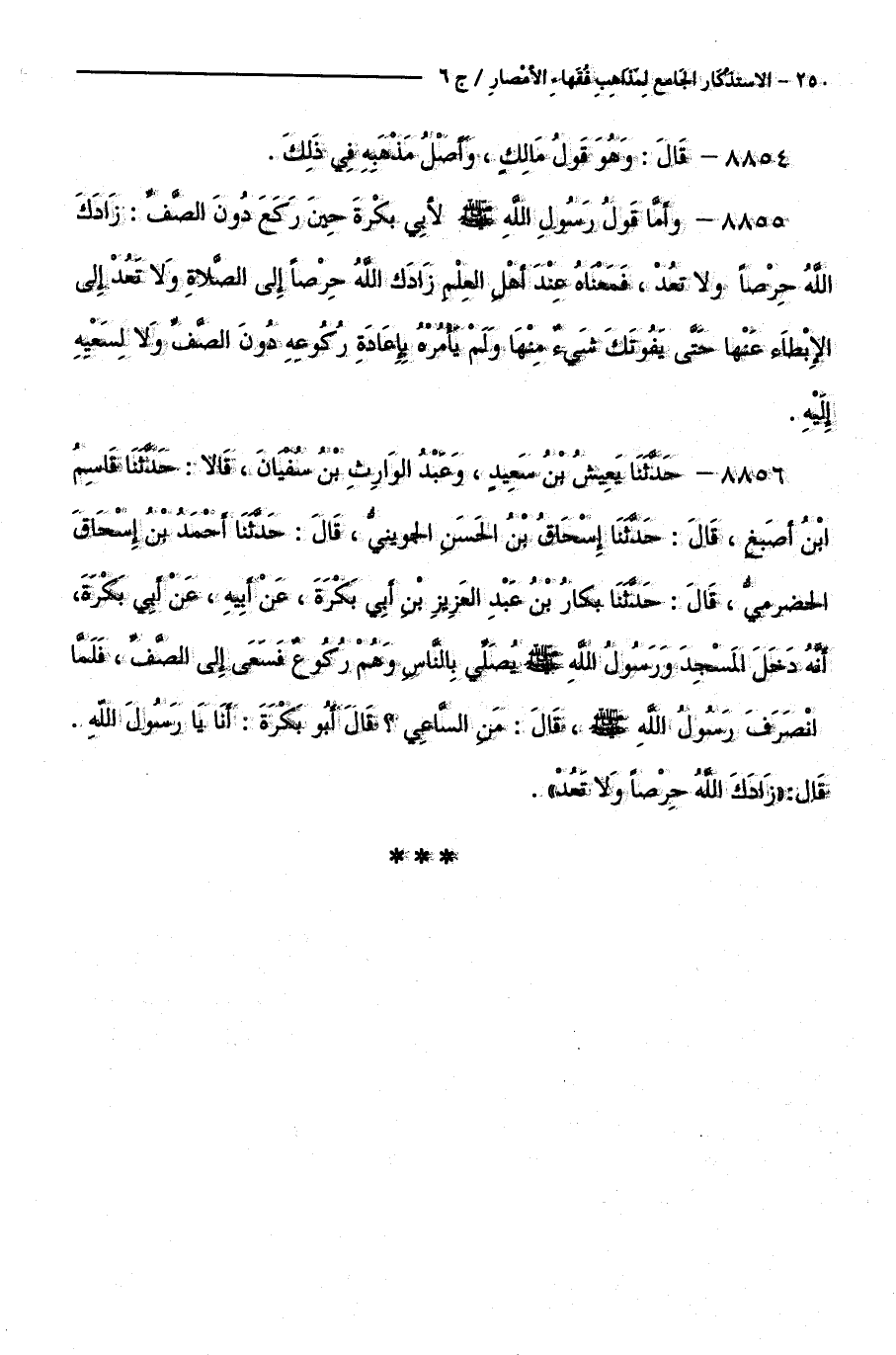 8856 - حَدَّثَنَا يَعِيشُ بْنُ سَعِيدٍ، وَعَبْدُ الْوَارِثِ بْنُ سُفْيَانَ، قَالَا: حَدَّثَنَا قَاسِمُ بْنُ أَصْبَغَ قَالَ: حَدَّثَنَا إِسْحَاقُ بْنُ الْحَسَنِ الْجُوَيْنِيُّ، قَالَ: حَدَّثَنَا أَحْمَدُ بْنُ إِسْحَاقَ الْحَضْرَمِيُّ، قَالَ: حَدَّثَنَا بَكَّارُ بْنُ عَبْدِ الْعَزِيزِ بْنِ أَبِي بَكْرَةَ، عَنْ أَبِيهِ،عَنْ أَبِي بَكْرَةَ، أَنَّهُ دَخَلَ الْمَسْجِدَ وَرَسُولُ اللَّهِ - صَلَّى اللَّهُ عَلَيْهِ وَسَلَّمَ - يُصَلِّي بِالنَّاسِ وَهُمْ رُكُوعٌ فَسَعَى إِلَى الصَّفِّ، فَلَمَّا انْصَرَفَ رَسُولُ اللَّهِ - صَلَّى اللَّهُ عَلَيْهِ وَسَلَّمَ - قَالَ: مَنِ السَّاعِي ؟ قَالَ أَبُو بَكْرَةَ: أَنَا يَا رَسُولَ اللَّهِ، قَالَ " زَادَكَ اللَّهُ حِرْصًا وَلَا تَعُدْ ".