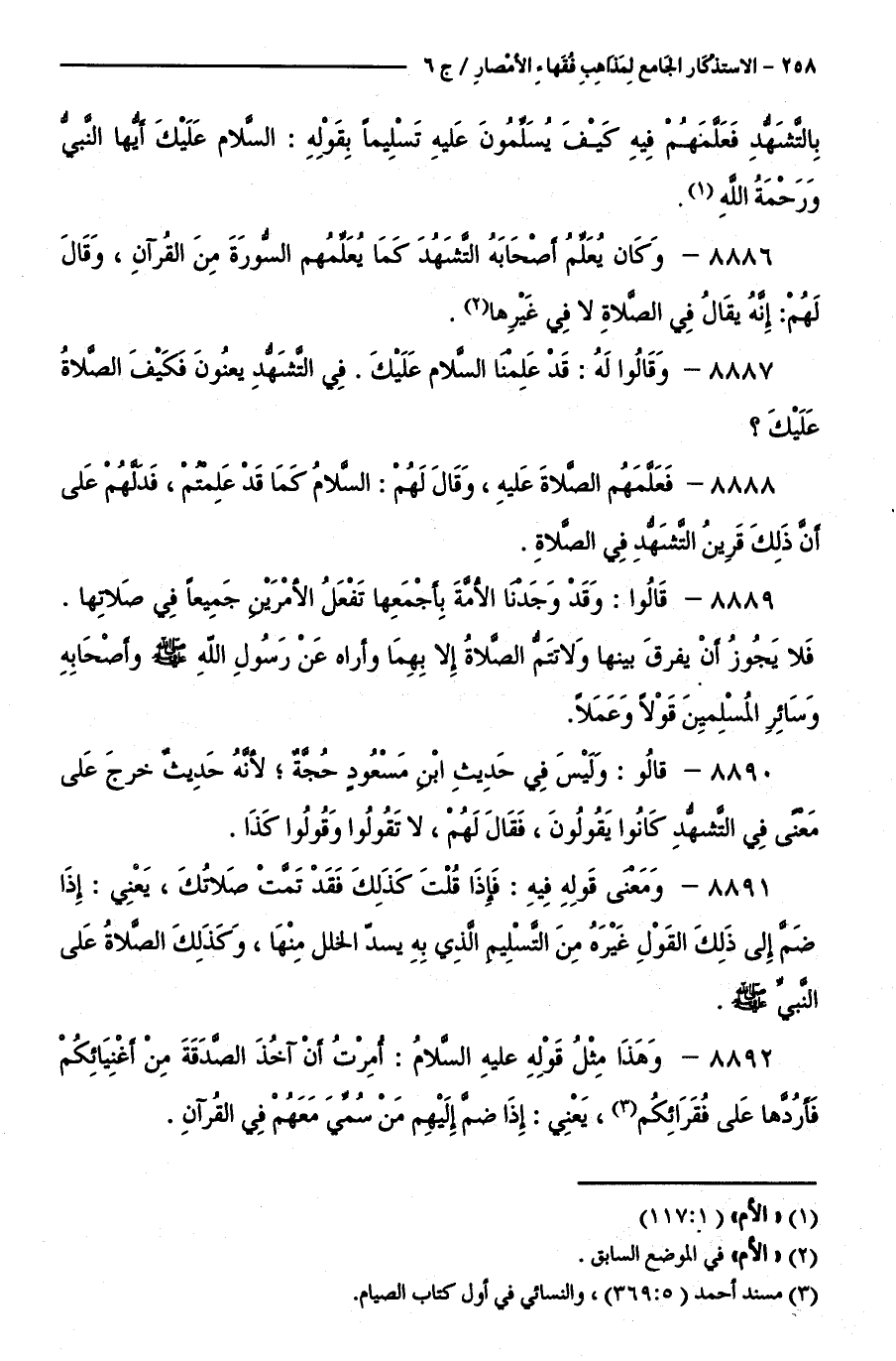 8886 -وَكَانَ يُعَلِّمُ أَصْحَابَهُ التَّشَهُّدَ كَمَا يُعَلِّمُهُمُ السُّورَةَ مِنَ الْقُرْآنِ، وَقَالَ لَهُمْ: إِنَّهُ يُقَالُ فِي الصَّلَاةِ لَا فِي غَيْرِهَا.