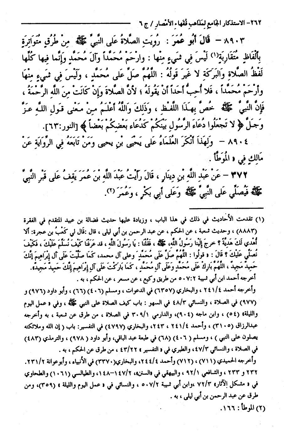 8903 - قَالَ أَبُو عُمَرَ: رُوِيَتِ الصَّلَاةُ عَلَى النَّبِيِّ - صَلَّى اللَّهُ عَلَيْهِ وَسَلَّمَ - مِنْ طُرُقٍ مُتَوَاتِرَةٍ بِأَلْفَاظٍ مُتَقَارِبَةٍ لَيْسَ فِي شَيْءٍ مِنْهَا: وَارْحَمْ مُحَمَّدًا وَآلَ مُحَمَّدٍ، وَإِنَّمَا فِيهَا كُلُّهَا لَفْظُ الصَّلَاةِ وَالْبَرَكَةِ لَا غَيْرَ، قَوْلُهُ:اللَّهُمَّ صَلِّ عَلَى مُحَمَّدٍ، وَلَيْسَ فِي شَيْءٍ مِنْهَا وَارْحَمْ مُحَمَّدًا، فَلَا أُحِبُّ أَحَدًا أَنْ يَقُولَهُ ; لِأَنَّ الصَّلَاةَ وَإِنْ كَانَتْ مِنَ اللَّهِ الرَّحْمَةَ، فَإِنَّ النَّبِيَّ - صَلَّى اللَّهُ عَلَيْهِ وَسَلَّمَ - خُصَّ بِهَذَا اللَّفْظِ، وَذَلِكَ وَاللَّهُ أَعْلَمُ مِنْ مَعْنَى قَوْلِ اللَّهِ - عَزَّ وَجَلَّ - "لَا تَجْعَلُوا دُعَاءَ الرَّسُولِ بَيْنَكُمْ كَدُعَاءِ بَعْضِكُمْ بَعْضًا " [ النُّورِ: 63 ].