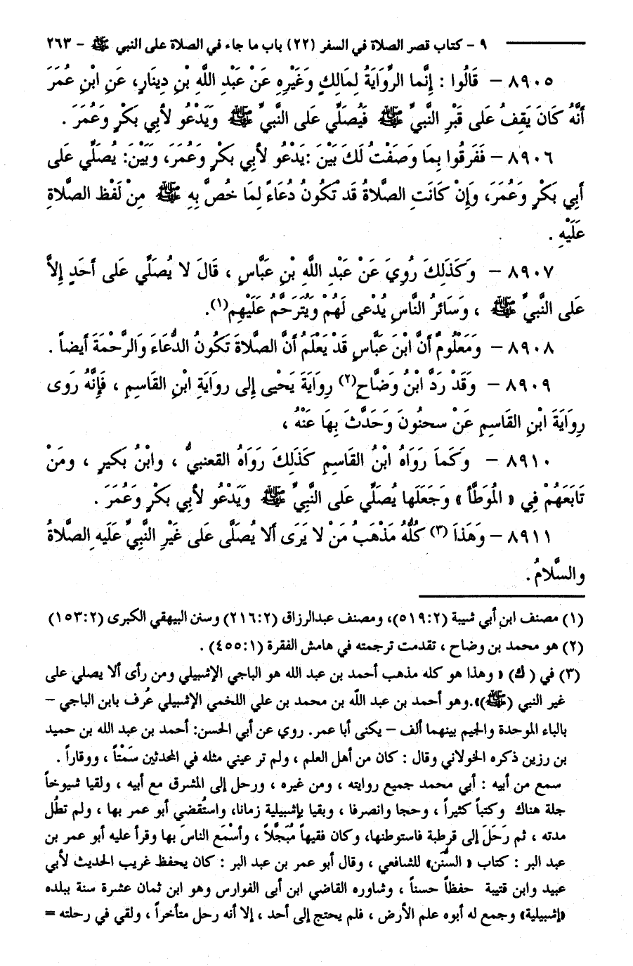 8905 - قَالُوا: إِنَّمَا الرِّوَايَةُ لِمَالِكٍ وَغَيْرِهِ عَنْ عَبْدِ اللَّهِ بْنِ دِينَارٍ، عَنِ ابْنِ عُمَرَ أَنَّهُ كَانَ يَقِفُ عَلَى قَبْرِ النَّبِيِّ - صَلَّى اللَّهُ عَلَيْهِ وَسَلَّمَ - فَيُصَلِّي عَلَى النَّبِيِّ - صَلَّى اللَّهُ عَلَيْهِ وَسَلَّمَ - وَيَدْعُو لِأَبِي بَكْرٍ وَعُمَرَ.