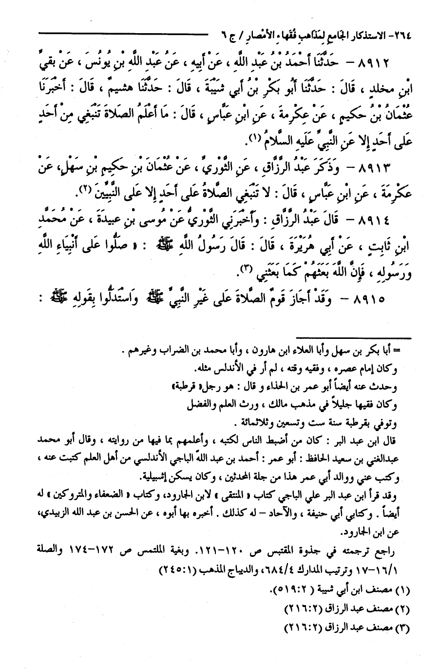 8912 - حَدَّثَنَا أَحْمَدُ بْنُ عَبْدِ اللَّهِ، عَنْ أَبِيهِ، عَنْ عَبْدِ اللَّهِ بْنِ يُونُسَ، عَنْ بَقِيِّ بْنِ مَخْلَدٍ، قَالَ: حَدَّثَنَا أَبُو بَكْرِ بْنُ أَبِي شَيْبَةَ، قَالَ: حَدَّثَنَا هُشَيْمٌ، قَالَ: أَخْبَرَنَا عُثْمَانُ بْنُ حَكِيمٍ، عَنْ عِكْرِمَةَ، عَنِ ابْنِ عَبَّاسٍ، قَالَ: مَا أَعْلَمُ الصَّلَاةَ تَنْبَغِي مِنْ أَحَدٍ عَلَى أَحَدٍ إِلَّا عَنِ النَّبِيِّ - عَلَيْهِ السَّلَامُ -.