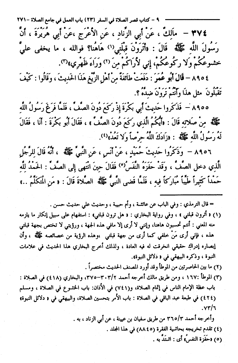 374 - مَالِكٌ عَنْ أَبِي الزِّنَادِ، عَنِ الْأَعْرَجِ، عَنْ أَبِي هُرَيْرَةَ، أَنَّ رَسُولَ اللَّهِ - صَلَّى اللَّهُ عَلَيْهِ وَسَلَّمَ - قَالَ: "أَتَرَوْنَ قِبْلَتِي هَاهُنَا ؟ فَوَاللَّهِ، مَا يَخْفَى عَلَيَّ خُشُوعُكُمْ وَلَا رُكُوعُكُمْ، إِنِّي لَأَرَاكُمْ مِنْ وَرَاءِ ظَهْرِي ".