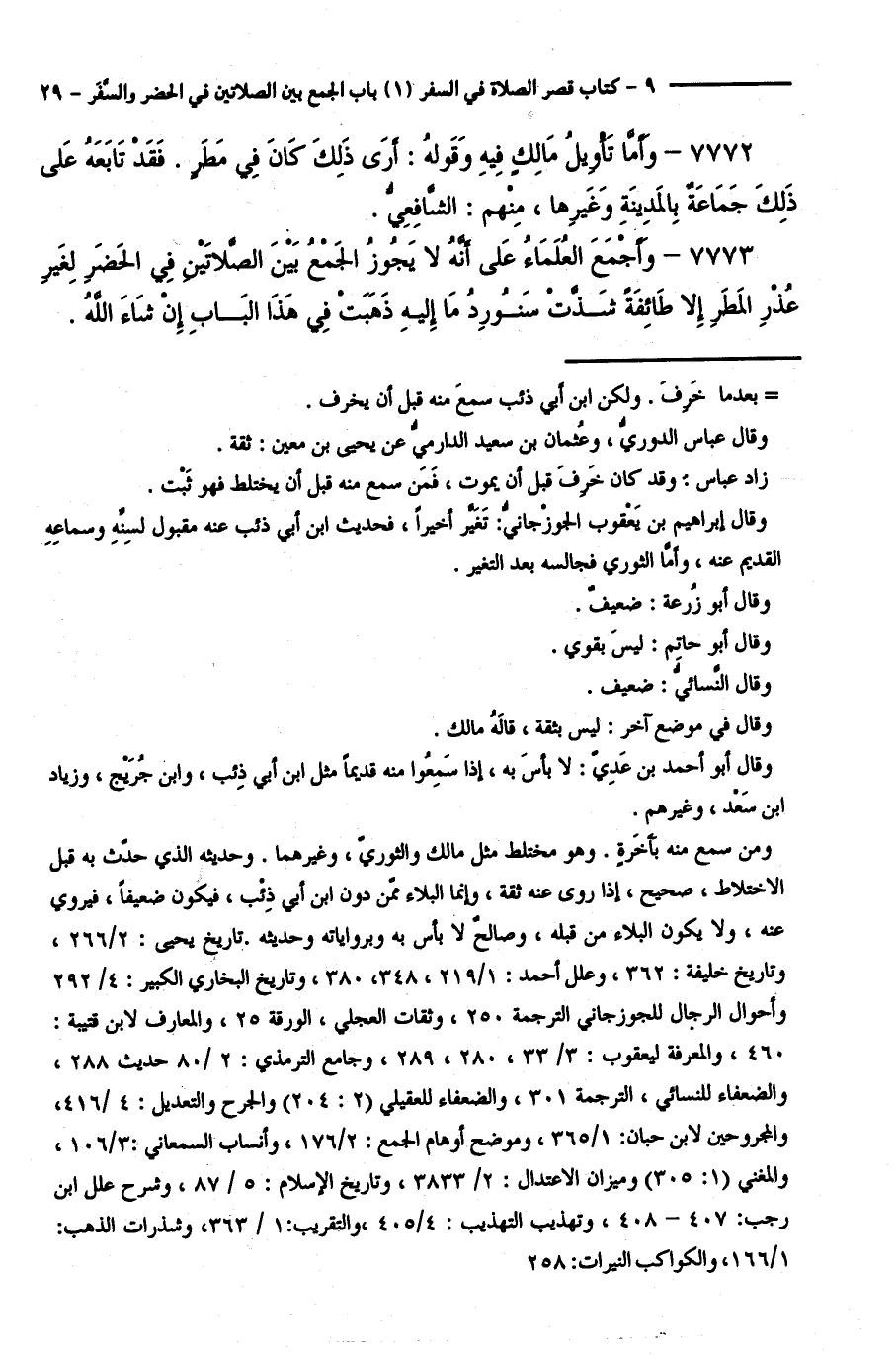 7773 - وَأَجْمَعَ الْعُلَمَاءُ عَلَى أَنَّهُ لَا يَجُوزُ الْجَمْعُ بَيْنَ الصَّلَاتَيْنِ فِي الْحَضَرِ لِغَيْرِ عُذْرِ الْمَطَرِ إِلَّا طَائِفَةً شَذَّتْ. سَنُورِدُ مَا إِلَيْهِ ذَهَبَتْ فِي هَذَا الْبَابِ إِنْ شَاءَ اللَّهُ.