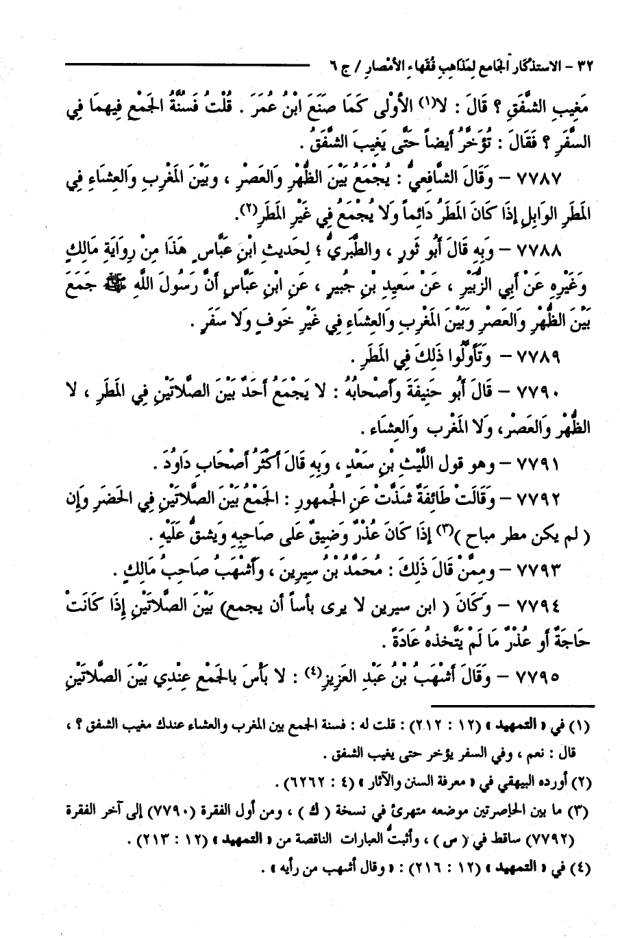7790 - قَالَ أَبُو حَنِيفَةَ وَأَصْحَابُهُ: لَا يَجْمَعُ أَحَدٌ بَيْنَ الصَّلَاتَيْنِ فِي الْمَطَرِ، لَا الظُّهْرِ وَالْعَصْرِ، وَلَا الْمَغْرِبِ وَالْعِشَاءِ.
