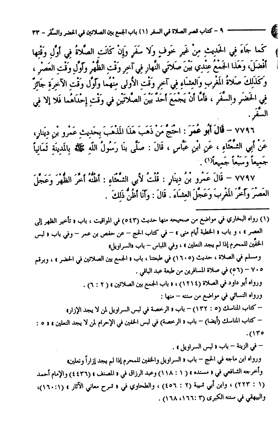 7796 - قَالَ أَبُو عُمَرَ: احْتَجَّ مَنْ ذَهَبَ هَذَا الْمَذْهَبَ بِحَدِيثِ عَمْرِو بْنِ دِينَارٍ، عَنْ أَبِي الشَّعْثَاءِ، عَنِ ابْنِ عَبَّاسٍ، قَالَ:صَلَّى بِنَا رَسُولُ اللَّهِ - صَلَّى اللَّهُ عَلَيْهِ وَسَلَّمَ - بِالْمَدِينَةِ ثَمَانِيًا جَمِيعًا وَسَبْعًا جَمِيعًا.