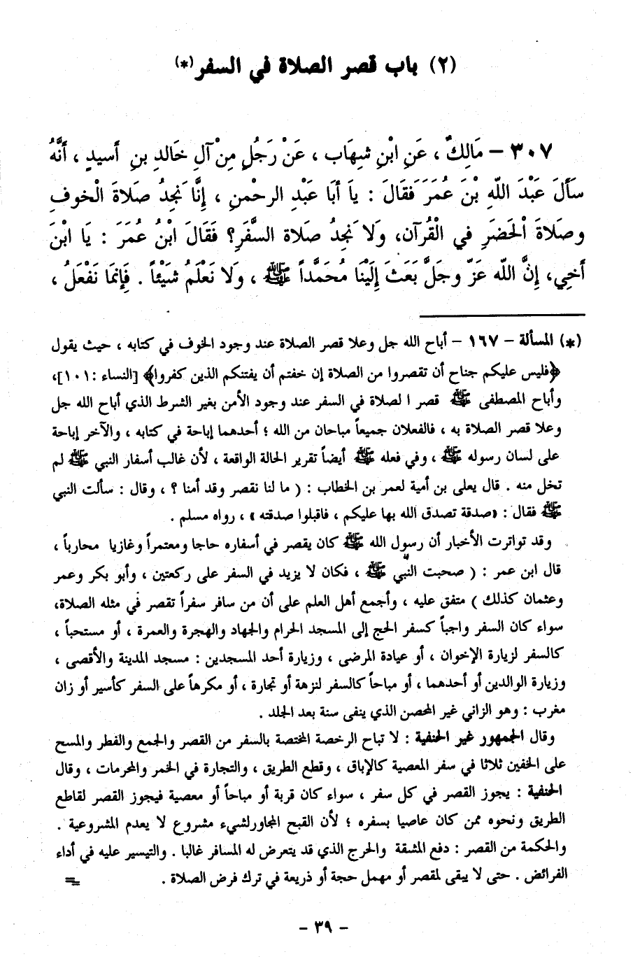 307 - مَالِكٌ، عَنِ ابْنِ شِهَابٍ، عَنْ رَجُلٍ مِنْ آلِ خَالِدِ بْنِ أُسِيدٍ، أَنَّهُ سَأَلَ عَبْدَ اللَّهِ بْنَ عُمَرَ فَقَالَ: يَا أَبَا عَبْدِ الرَّحْمَنِ، إِنَّا نَجِدُ صَلَاةَ الْخَوْفِ وَصَلَاةَ الْحَضَرِ فِي الْقُرْآنِ، وَلَا نَجِدُ صَلَاةَ السَّفَرِ ؟ فَقَالَ ابْنُ عُمَرَ: يَا ابْنَ أَخِي، إِنَّ اللَّهَ - عَزَّ وَجَلَّ - بَعَثَ إِلَيْنَا مُحَمَّدًا - صَلَّى اللَّهُ عَلَيْهِ وَسَلَّمَ - وَلَا نَعْلَمُ شَيْئًا. فَإِنَّمَا نَفْعَلُ