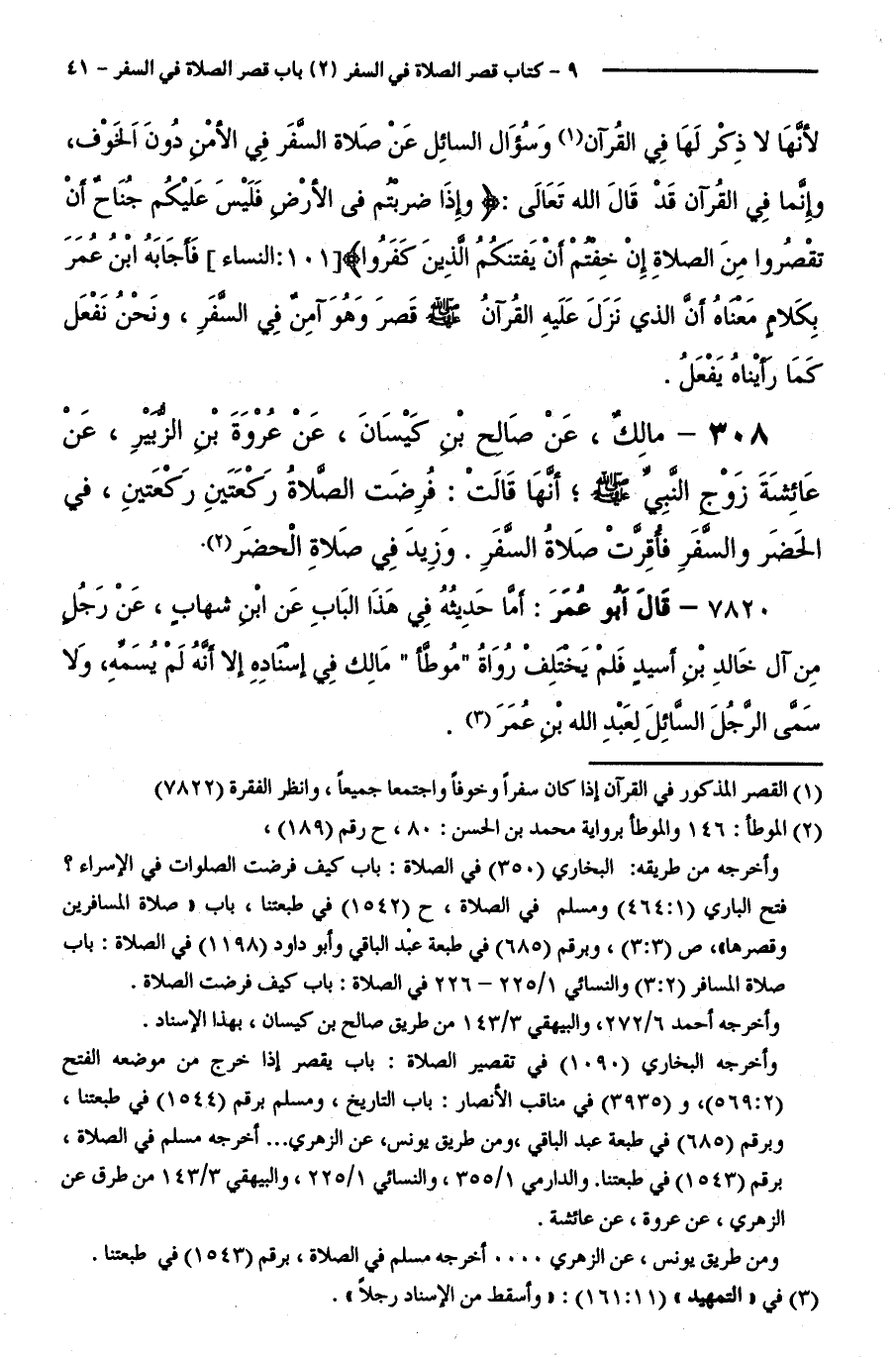 308 - مَالِكٌ، عَنْ صَالِحِ بْنِ كَيْسَانَ، عَنْ عُرْوَةَ بْنِ الزُّبَيْرِ، عَنْ عَائِشَةَ زَوْجِ النَّبِيِّ - صَلَّى اللَّهُ عَلَيْهِ وَسَلَّمَ - أَنَّهَا قَالَتْ:فُرِضَتِ الصَّلَاةُ رَكْعَتَيْنِ رَكْعَتَيْنِ، فِي الْحَضَرِ وَالسَّفَرِ فَأُقِرَّتْ صَلَاةُ السَّفَرِ. وَزِيدَ فِي صَلَاةِ الْحَضَرِ.