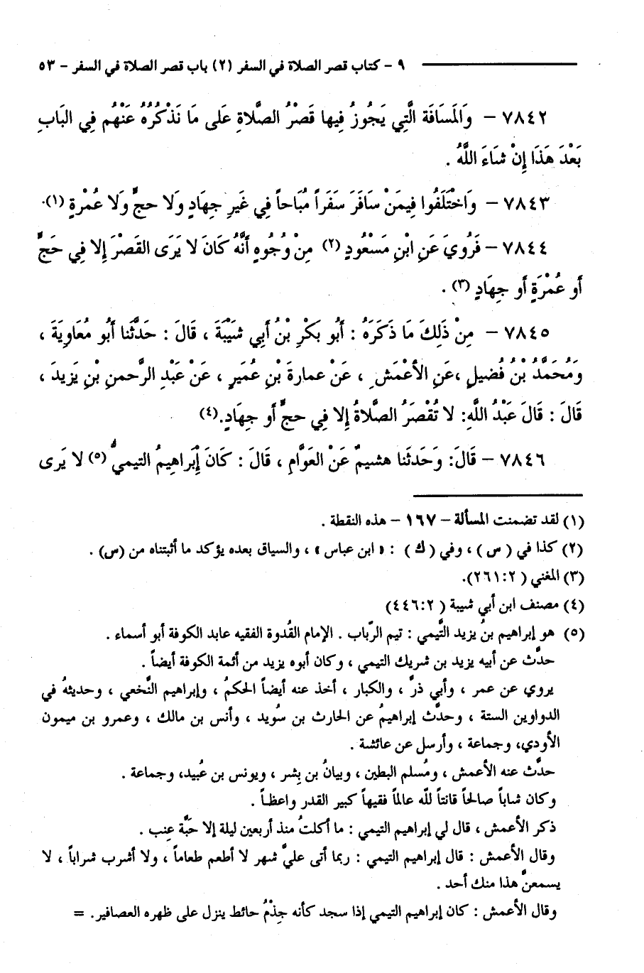 7844 - فَرُوِيَ عَنِ ابْنِ مَسْعُودٍ مِنْ وُجُوهٍ أَنَّهُ كَانَ لَا يَرَى الْقَصْرَ إِلَّا فِي حَجٍّ أَوْ عُمْرَةٍ أَوْ جِهَادٍ.